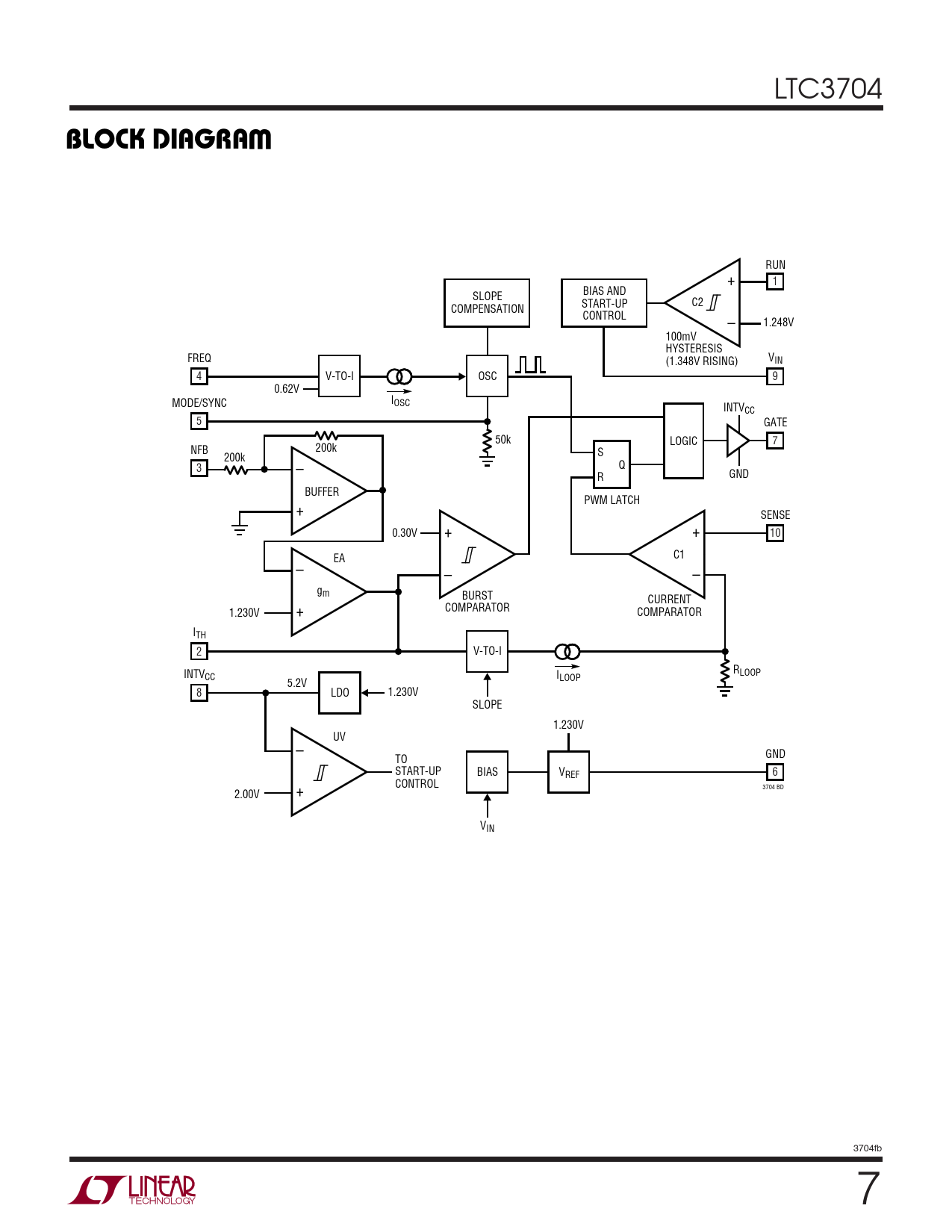 RUN + 1 BIAS AND SLOPE START-UP C2 COMPENSATION CONTROL – 1.248V 100mV HYSTERESIS FREQ VIN (1.348V RISING) 4 V-TO-I OSC 9 0.62V MODE/SYNC IOSC INTVCC 5 GATE 50k LOGIC 7 NFB 200k 200k – S Q 3 R GND BUFFER + PWM LATCH SENSE + 0.30V + 10 – EA C1 – – gm BURST + CURRENT COMPARATOR 1.230V COMPARATOR ITH 2 V-TO-I INTV R CC I LOOP LOOP 5.2V 8 LDO 1.230V SLOPE 1.230V UV – TO GND START-UP BIAS VREF 6 + CONTROL 3704 BD 2.00V VIN 3704fb 7