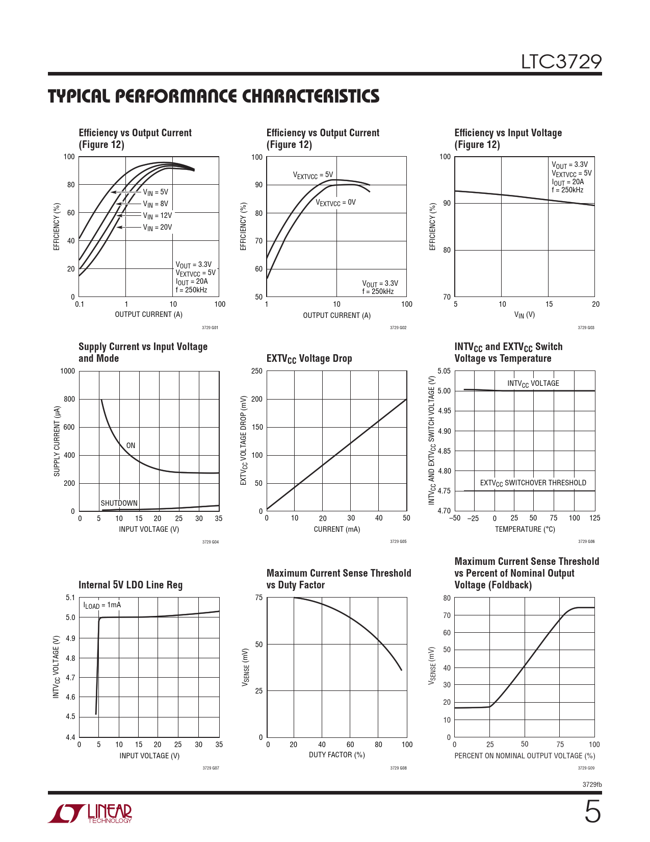 100 100 100 VOUT = 3.3V VEXTVCC = 5V VEXTVCC = 5V 80 90 IOUT = 20A VIN = 5V f = 250kHz VIN = 8V VEXTVCC = 0V 90 60 V 80 IN = 12V VIN = 20V 40 70 EFFICIENCY (%) EFFICIENCY (%) EFFICIENCY (%) 80 20 VOUT = 3.3V V 60 EXTVCC = 5V IOUT = 20A VOUT = 3.3V f = 250kHz f = 250kHz 0 50 70 0.1 1 10 100 1 10 100 5 10 15 20 OUTPUT CURRENT (A) OUTPUT CURRENT (A) VIN (V) 3729 G01 3729 G02 3729 G03