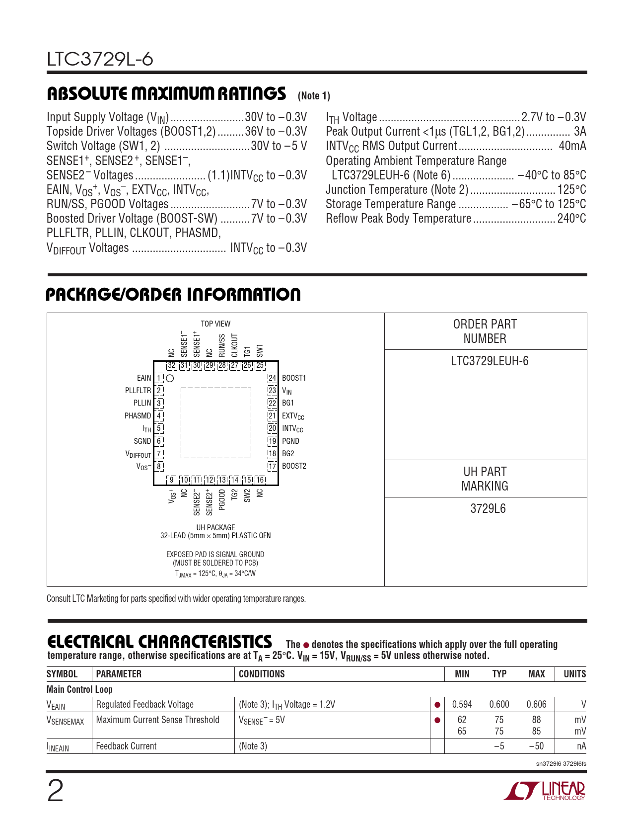 TOP VIEW ORDER PART – + NUMBER NC SENSE1 SENSE1 NC RUN/SS CLKOUT TG1 SW1 LTC3729LEUH-6 32 31 30 29 28 27 26 25 EAIN 1 24 BOOST1 PLLFLTR 2 23 VIN PLLIN 3 22 BG1 PHASMD 4 21 EXTVCC I 5 20 TH INTVCC SGND 6 19 PGND V 7 18 DIFFOUT BG2 V – 8 17 OS BOOST2 UH PART 9 10 11 12 13 14 15 16 + – + MARKING OS NC NC V TG2 SW2 PGOOD 3729L6 SENSE2 SENSE2 UH PACKAGE 32-LEAD (5mm × 5mm) PLASTIC QFN EXPOSED PAD IS SIGNAL GROUND (MUST BE SOLDERED TO PCB) TJMAX = 125°C, θJA = 34°C/W Consult LTC Marketing for parts specified with wider operating temperature ranges.