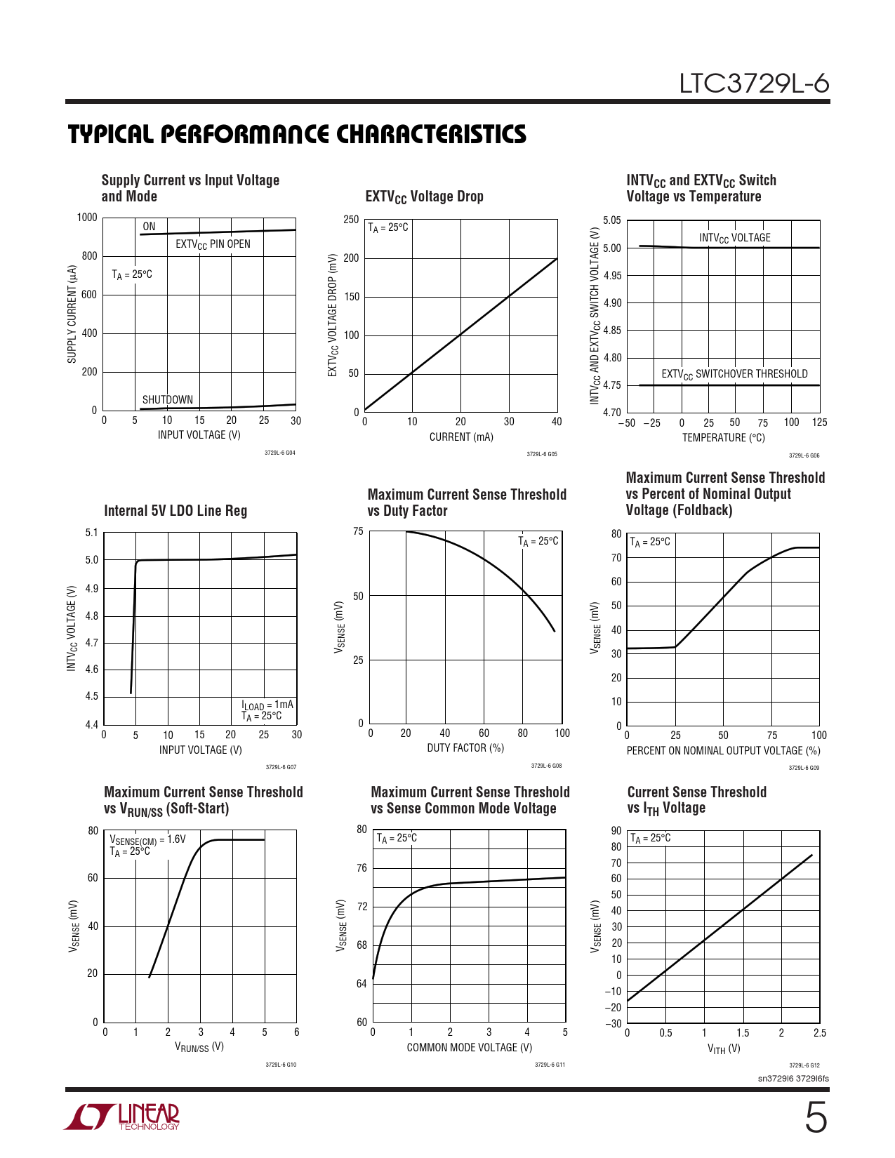 LTC3729L-6 WUTYPICAL PERFOR A CE CHARACTERISTICSSupply Current vs Input VoltageINTVCC and EXTVCC Switchand ModeEXTVVoltage vs TemperatureCC Voltage Drop 1000 250 5.05 ON TA = 25°C INTV EXTV CC VOLTAGE CC PIN OPEN 5.00 800 200 µA) TA = 25°C 4.95 600 150 4.90 SWITCH VOLTAGE (V) CC 400 4.85 100 VOLTAGE DROP (mV) CC SUPPLY CURRENT ( 4.80 200 EXTV 50 AND EXTV EXTVCC SWITCHOVER THRESHOLD CC 4.75 SHUTDOWN INTV 0 0 4.70 0 5 10 15 20 25 30 0 10 20 30 40 – 50 – 25 0 25 50 75 100 125 INPUT VOLTAGE (V) CURRENT (mA) TEMPERATURE (°C) 3729L-6 G04 3729L-6 G05 3729L-6 G06 Maximum Current Sense ThresholdMaximum Current Sense Thresholdvs Percent of Nominal OutputInternal 5V LDO Line Regvs Duty FactorVoltage (Foldback) 5.1 75 80 TA = 25°C TA = 25°C 5.0 70 60 4.9 50 50 4.8 (mV) (mV) 40 VOLTAGE (V) 4.7 CC SENSEV SENSEV 30 25 INTV 4.6 20 4.5 I 10 LOAD = 1mA TA = 25°C 4.4 0 0 0 5 10 15 20 25 30 0 20 40 60 80 100 0 25 50 75 100 INPUT VOLTAGE (V) DUTY FACTOR (%) PERCENT ON NOMINAL OUTPUT VOLTAGE (%) 3729L-6 G07 3729L-6 G08 3729L-6 G09 Maximum Current Sense ThresholdMaximum Current Sense ThresholdCurrent Sense Thresholdvs VRUN/SS (Soft-Start)vs Sense Common Mode Voltagevs ITH Voltage 80 80 90 V T SENSE(CM) = 1.6V A = 25°C TA = 25°C T 80 A = 25°C 70 76 60 60 50 72 40 (mV) (mV) (mV) 40 30 SENSE SENSE SENSE 20 V V 68 V 10 20 0 64 –10 –20 0 60 –30 0 1 2 3 4 5 6 0 1 2 3 4 5 0 0.5 1 1.5 2 2.5 VRUN/SS (V) COMMON MODE VOLTAGE (V) VITH (V) 3729L-6 G10 3729L-6 G11 3729L-6 G12 sn3729l6 3729l6fs 5