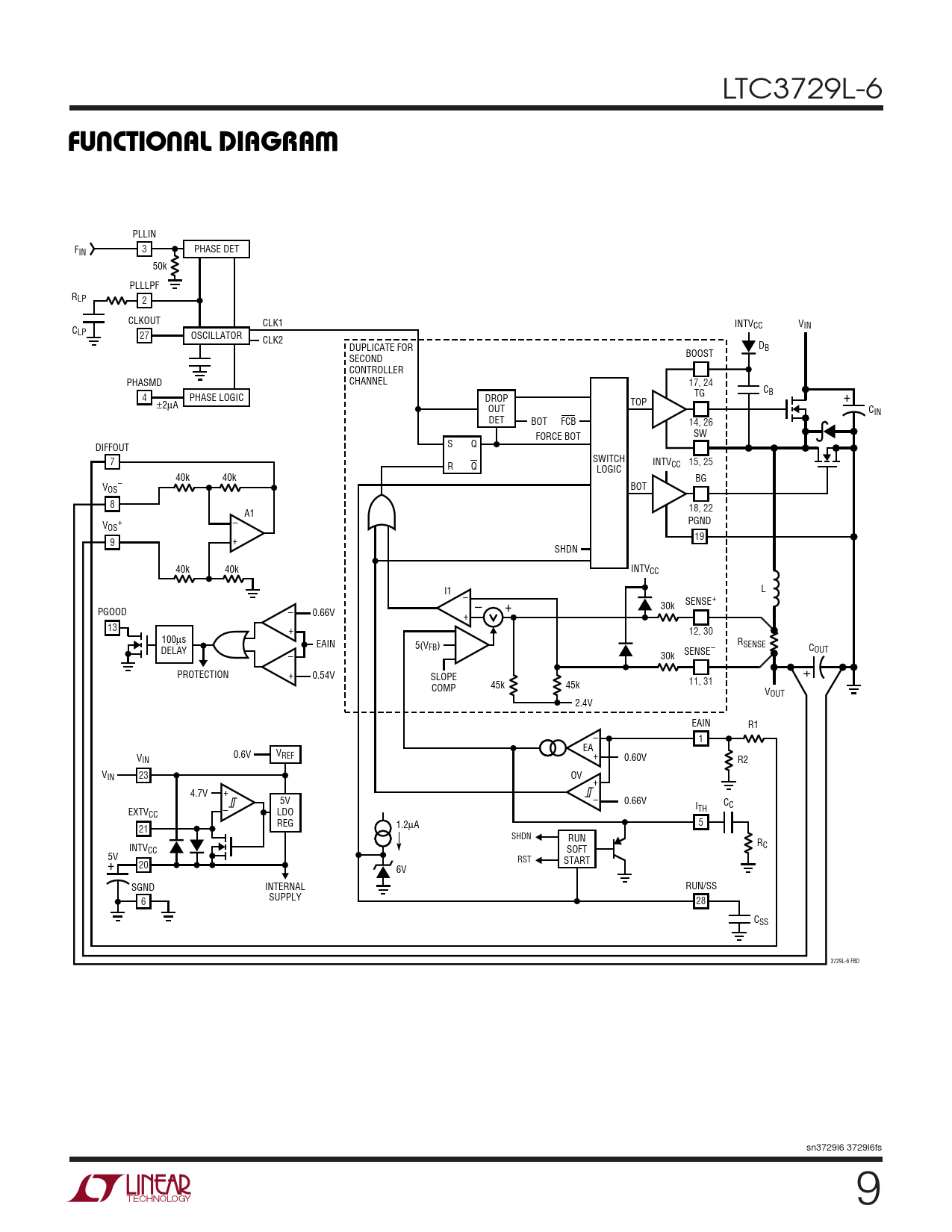 PLLIN F 3 PHASE DET IN 50k PLLLPF RLP 2 CLKOUT CLK1 INTVCC VIN CLP 27 OSCILLATOR CLK2 D DUPLICATE FOR B BOOST SECOND CONTROLLER PHASMD CHANNEL 17, 24 4 PHASE LOGIC TG CB DROP + ±2µA TOP OUT CIN DET BOT FCB 14, 26 SW FORCE BOT S Q DIFFOUT SWITCH 7 INTVCC R Q 15, 25 LOGIC 40k 40k BG V – BOT OS 8 18, 22 A1 + PGND – VOS 19 9 + SHDN 40k 40k INTVCC I1 L – SENSE+ 30k – + PGOOD – 0.66V + 13 + 12, 30 100µs EAIN 5(V R FB) SENSE DELAY SENSE– COUT – 30k PROTECTION + 0.54V SLOPE + 11, 31 COMP 45k 45k VOUT 2.4V EAIN R1 – 1 EA 0.6V V V REF + IN 0.60V R2 VIN 23 OV + 4.7V + 5V – 0.66V I CC EXTV – TH CC LDO REG 1.2µA 5 21 SHDN RUN R INTV C CC SOFT 5V + RST START 20 6V SGND INTERNAL RUN/SS SUPPLY 6 28 CSS 3729L-6 FBD sn3729l6 3729l6fs 9
