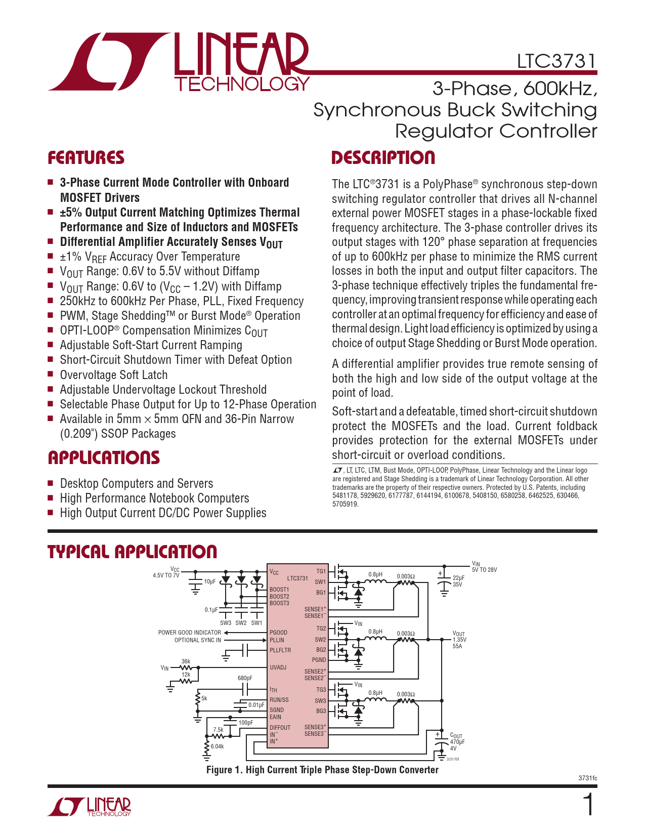 LTC3731 3-Phase, 600kHz, Synchronous Buck Switching Regulator Controller FEATURESDESCRIPTION n 3-Phase Current Mode Controller with Onboard The LTC®3731 is a PolyPhase® synchronous step-down MOSFET Drivers switching regulator controller that drives all N-channel n ±5% Output Current Matching Optimizes Thermal external power MOSFET stages in a phase-lockable fixed Performance and Size of Inductors and MOSFETs frequency architecture. The 3-phase controller drives its n Differential Amplifier Accurately Senses VOUT output stages with 120° phase separation at frequencies n ±1% VREF Accuracy Over Temperature of up to 600kHz per phase to minimize the RMS current n VOUT Range: 0.6V to 5.5V without Diffamp losses in both the input and output filter capacitors. The n V 3-phase technique effectively triples the fundamental fre- OUT Range: 0.6V to (VCC – 1.2V) with Diffamp n 250kHz to 600kHz Per Phase, PLL, Fixed Frequency quency, improving transient response while operating each n PWM, Stage Shedding™ or Burst Mode® Operation controller at an optimal frequency for efficiency and ease of n OPTI-LOOP® Compensation Minimizes C thermal design. Light load efficiency is optimized by using a OUT n Adjustable Soft-Start Current Ramping choice of output Stage Shedding or Burst Mode operation. n Short-Circuit Shutdown Timer with Defeat Option A differential amplifier provides true remote sensing of n Overvoltage Soft Latch both the high and low side of the output voltage at the n Adjustable Undervoltage Lockout Threshold point of load. n Selectable Phase Output for Up to 12-Phase Operation Soft-start and a defeatable, timed short-circuit shutdown n Available in 5mm × 5mm QFN and 36-Pin Narrow protect the MOSFETs and the load. Current foldback (0.209") SSOP Packages provides protection for the external MOSFETs under short-circuit or overload conditions. APPLICATIONS L, LT, LTC, LTM, Bust Mode, OPTI-LOOP, PolyPhase, Linear Technology and the Linear logo are registered and Stage Shedding is a trademark of Linear Technology Corporation. All other n Desktop Computers and Servers trademarks are the property of their respective owners. Protected by U.S. Patents, including n High Performance Notebook Computers 5481178, 5929620, 6177787, 6144194, 6100678, 5408150, 6580258, 6462525, 630466, 5705919. n High Output Current DC/DC Power Supplies TYPICAL APPLICATION VIN VCC 5V TO 28V VCC TG1 4.5V TO 7V 0.8µH + 0.003Ω LTC3731 22µF 10µF SW1 35V BOOST1 BG1 BOOST2 BOOST3 0.1µF SENSE1+ SENSE1– SW3 SW2 SW1 VIN TG2 POWER GOOD INDICATOR PGOOD 0.8µH 0.003Ω VOUT OPTIONAL SYNC IN PLLIN SW2 1.35V 55A PLLFLTR BG2 36k PGND VIN UVADJ SENSE2+ 12k 680pF SENSE2– VIN ITH TG3 0.8µH 0.003Ω 5k RUN/SS SW3 0.01µF SGND BG3 EAIN 100pF DIFFOUT SENSE3+ 7.5k SENSE3– IN– + COUT IN+ 470µF 6.04k 4V 3731 F01 Figure 1. High Current Triple Phase Step-Down Converter 3731fc 1 Document Outline Features Applications Features Description Typical Application Absolute Maximum Ratings Pin Configuration Order Information Electrical Characteristics Typical Performance Characteristics Pin Functions Functional Diagram Operation Applications Information Typical Applications Package Description Revision History Typical Application Related Parts