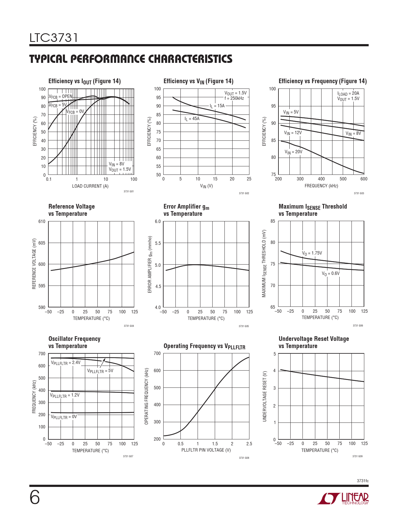 610 6.0 85 605 5.5 80 (mmho) m VO = 1.75V 600 5.0 THRESHOLD (mV) 75 SENSE VO = 0.6V REFERENCE VOLTAGE (mV) 595 4.5 70 ERROR AMPLIFIER g MAXIMUM I 590 4.0 65 –50 –25 0 25 50 75 100 125 –50 –25 0 25 50 75 100 125 –50 –25 0 25 50 75 100 125 TEMPERATURE (°C) TEMPERATURE (°C) TEMPERATURE (°C) 3731 G04 3731 G05 3731 G06