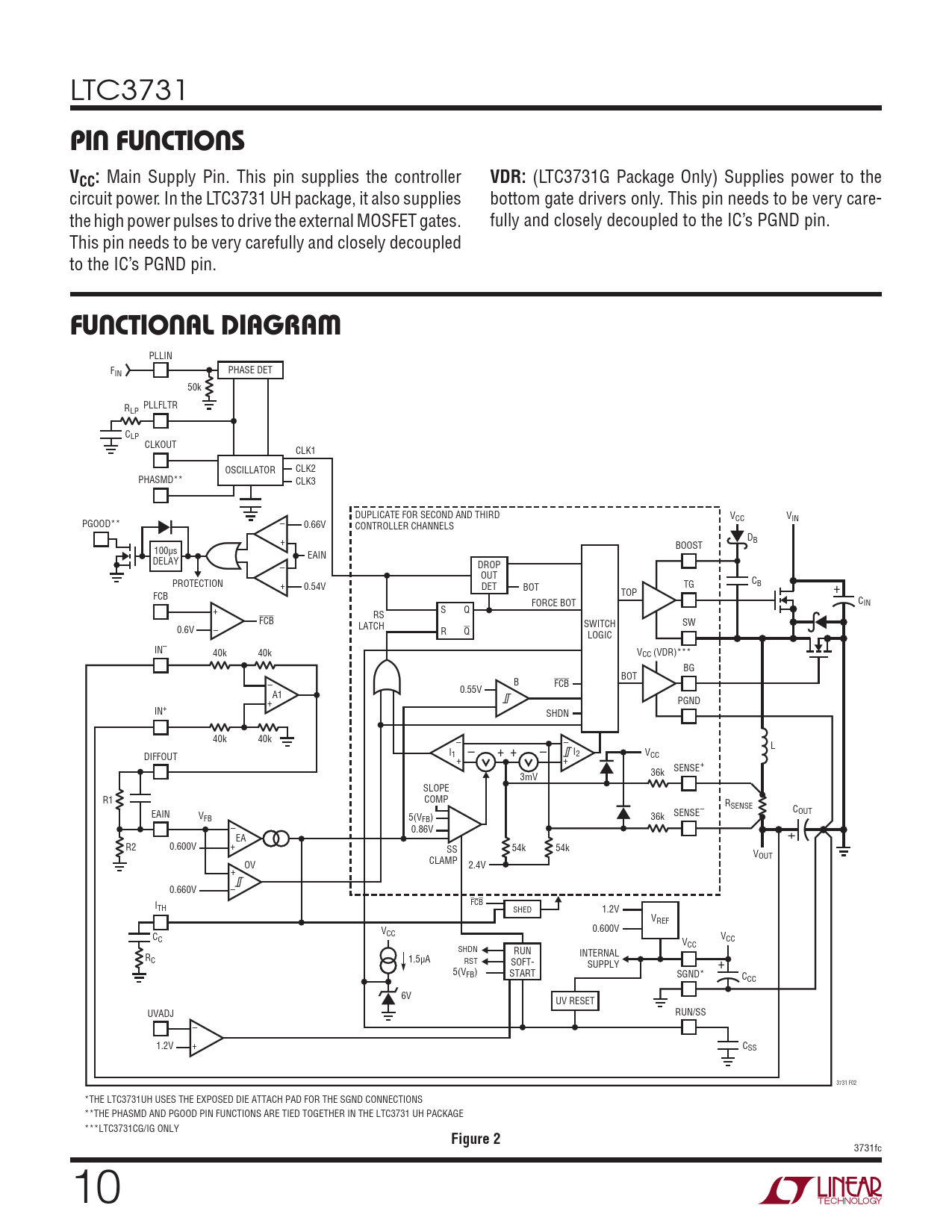 (LTC3731G Package Only) Supplies power to the circuit power. In the LTC3731 UH package, it also supplies bottom gate drivers only. This pin needs to be very care- the high power pulses to drive the external MOSFET gates. fully and closely decoupled to the IC’s PGND pin. This pin needs to be very carefully and closely decoupled to the IC’s PGND pin.