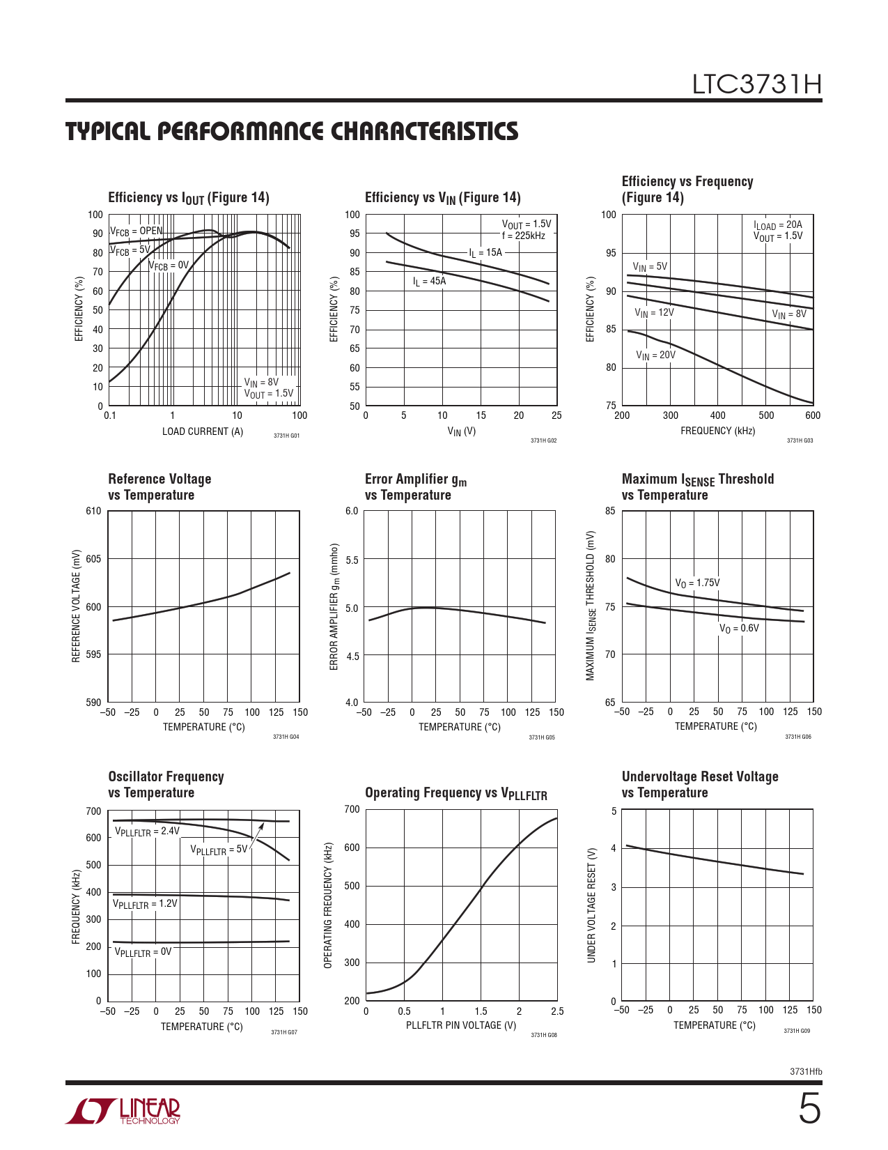 610 6.0 85 605 5.5 80 (mmho) m VO = 1.75V 600 5.0 THRESHOLD (mV) 75 SENSE VO = 0.6V REFERENCE VOLTAGE (mV) 595 4.5 70 ERROR AMPLIFIER g MAXIMUM I 590 4.0 65 –50 –25 0 25 50 75 100 125 150 –50 –25 0 25 50 75 100 125 150 –50 –25 0 25 50 75 100 125 150 TEMPERATURE (°C) TEMPERATURE (°C) TEMPERATURE (°C) 3731H G04 3731H G05 3731H G06