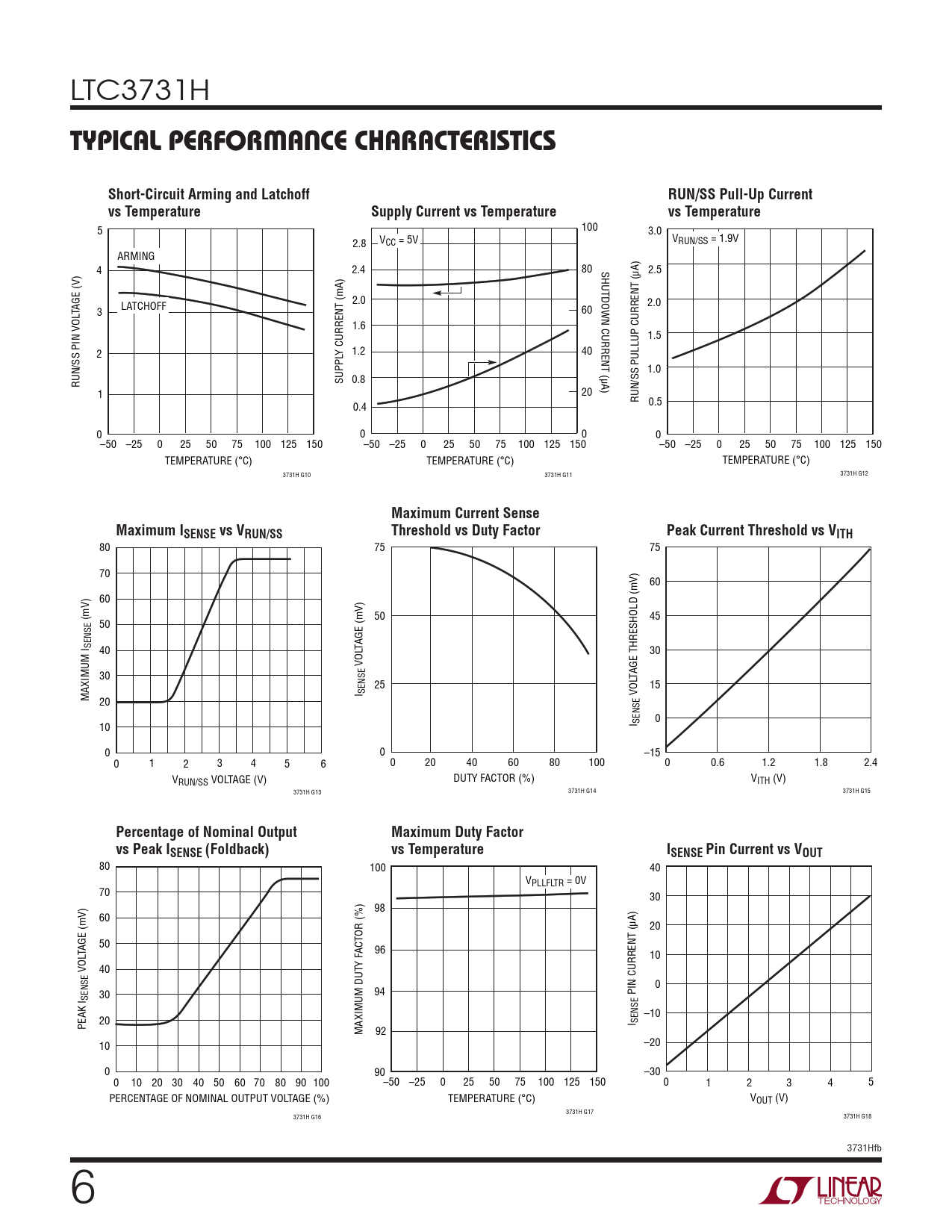 5 100 3.0 2.8 VCC = 5V VRUN/SS = 1.9V ARMING 4 SHUTDOWN CURRENT (µA) 2.4 80 2.5 2.0 2.0 TAGE (V) 3 LATCHOFF 60 1.6 1.5 2 Y CURRENT (mA) 1.2 40 1.0 RUN/SS PIN VOL SUPPL 0.8 1 20 RUN/SS PULLUP CURRENT (µA) 0.4 0.5 0 0 0 0 –50 –25 0 25 50 75 100 125 150 –50 –25 0 25 50 75 100 125 150 –50 –25 0 25 50 75 100 125 150 TEMPERATURE (°C) TEMPERATURE (°C) TEMPERATURE (°C) 3731H G10 3731H G11 3731H G12