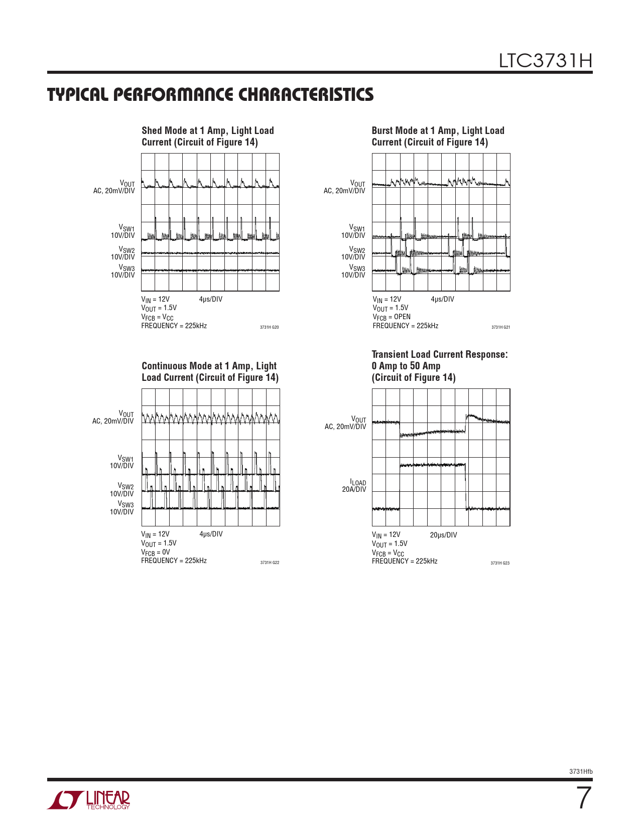 VOUT VOUT AC, 20mV/DIV AC, 20mV/DIV VSW1 VSW1 10V/DIV 10V/DIV VSW2 VSW2 10V/DIV 10V/DIV VSW3 VSW3 10V/DIV 10V/DIV VIN = 12V 4µs/DIV VIN = 12V 4µs/DIV VOUT = 1.5V VOUT = 1.5V VFCB = VCC VFCB = OPEN FREQUENCY = 225kHz 3731H G20 FREQUENCY = 225kHz 3731H G21