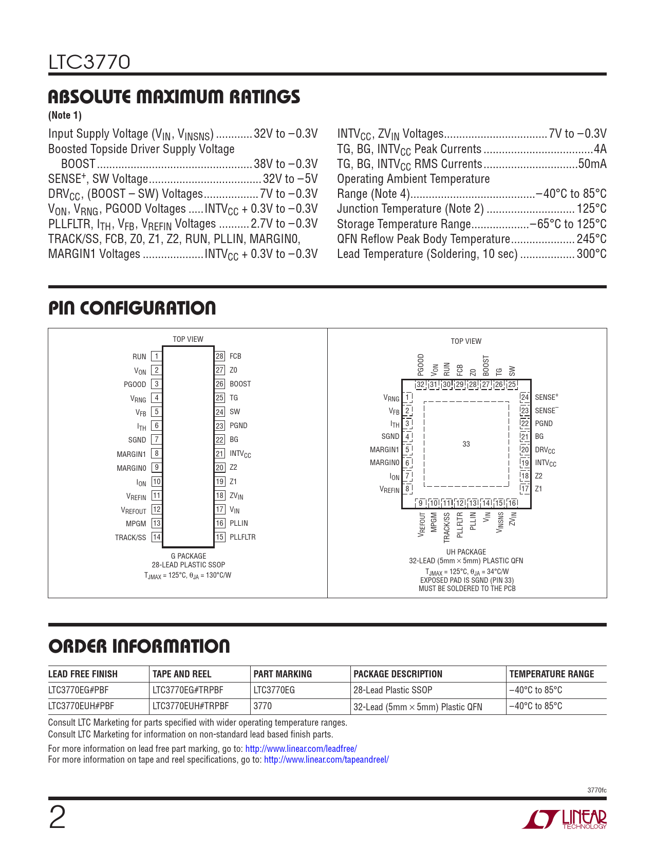 TOP VIEW TOP VIEW RUN 1 28 FCB V 2 27 ON Z0 ON PGOOD V RUN FCB Z0 BOOST TG SW PGOOD 3 26 BOOST 32 31 30 29 28 27 26 25 V 4 25 RNG TG V 1 24 RNG SENSE+ V 5 24 V 2 23 SENSE– FB SW FB I 6 23 ITH 3 22 PGND TH PGND SGND BG SGND 7 22 BG 4 21 33 MARGIN1 5 20 DRV MARGIN1 8 21 INTV CC CC MARGIN0 6 19 INTV MARGIN0 9 20 Z2 CC I 7 18 ON Z2 I 10 19 ON Z1 V 8 17 REFIN Z1 V 11 18 REFIN ZVIN 9 10 11 12 13 14 15 16 V 12 17 REFOUT VIN TR IN IN V MPGM 13 16 PLLIN ZV INSNS REFOUT MPGM PLLIN V TRACK/SS 14 15 PLLFLTR V PLLFL TRACK/SS UH PACKAGE G PACKAGE 32-LEAD (5mm s 5mm) PLASTIC QFN 28-LEAD PLASTIC SSOP T TJMAX = 125°C, θJA = 34°C/W JMAX = 125°C, θJA = 130°C/W EXPOSED PAD IS SGND (PIN 33) MUST BE SOLDERED TO THE PCB