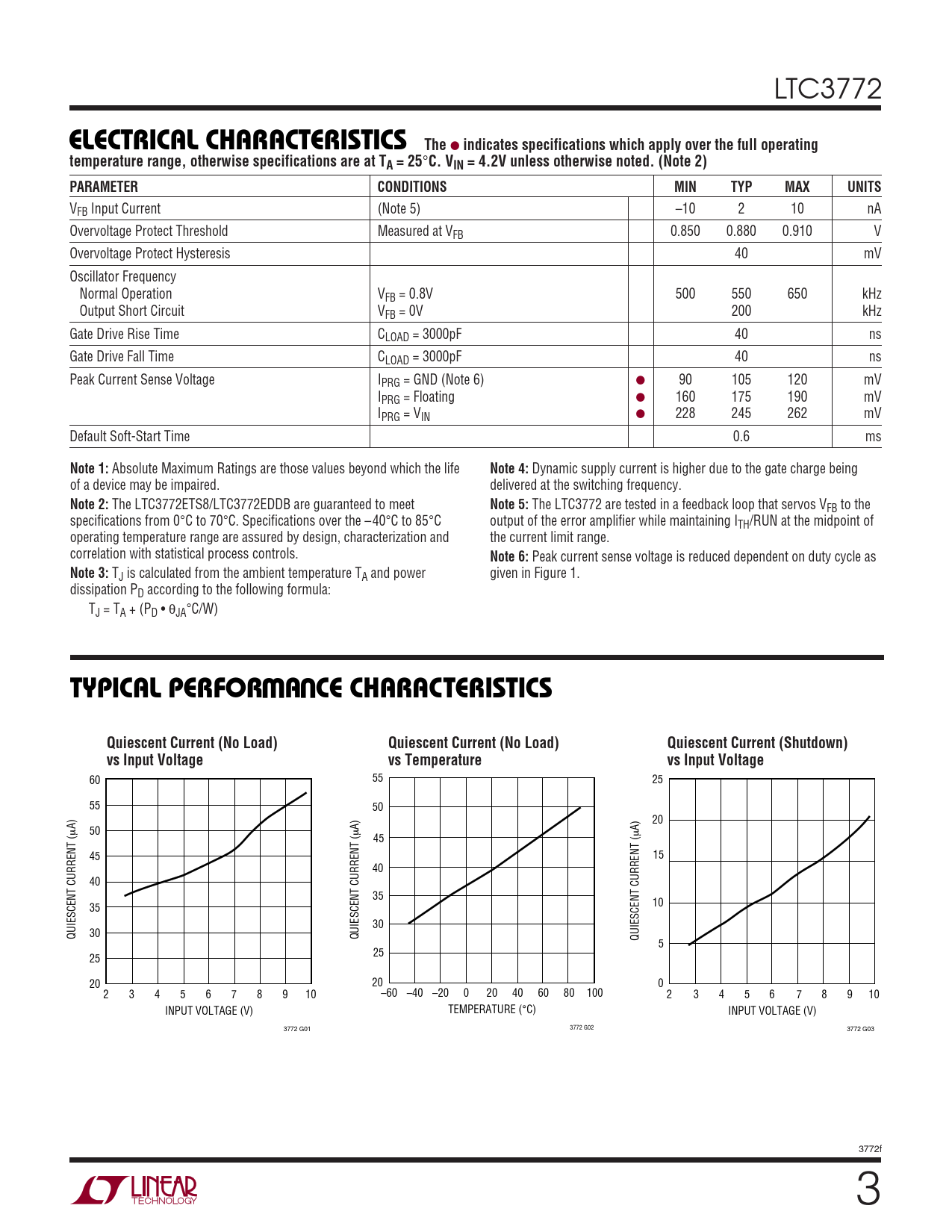 LTC3772 ELECTRICAL CHARACTERISTICS The ● indicates specifications which apply over the full operatingtemperature range, otherwise specifications are at TA = 25 ° C. VIN = 4.2V unless otherwise noted. (Note 2)PARAMETERCONDITIONSMINTYPMAXUNITS VFB Input Current (Note 5) –10 2 10 nA Overvoltage Protect Threshold Measured at VFB 0.850 0.880 0.910 V Overvoltage Protect Hysteresis 40 mV Oscillator Frequency Normal Operation VFB = 0.8V 500 550 650 kHz Output Short Circuit VFB = 0V 200 kHz Gate Drive Rise Time CLOAD = 3000pF 40 ns Gate Drive Fall Time CLOAD = 3000pF 40 ns Peak Current Sense Voltage IPRG = GND (Note 6) ● 90 105 120 mV IPRG = Floating ● 160 175 190 mV IPRG = VIN ● 228 245 262 mV Default Soft-Start Time 0.6 ms Note 1: Absolute Maximum Ratings are those values beyond which the life Note 4: Dynamic supply current is higher due to the gate charge being of a device may be impaired. delivered at the switching frequency. Note 2: The LTC3772ETS8/LTC3772EDDB are guaranteed to meet Note 5: The LTC3772 are tested in a feedback loop that servos VFB to the specifications from 0°C to 70°C. Specifications over the –40°C to 85°C output of the error amplifier while maintaining ITH/RUN at the midpoint of operating temperature range are assured by design, characterization and the current limit range. correlation with statistical process controls. Note 6: Peak current sense voltage is reduced dependent on duty cycle as Note 3: TJ is calculated from the ambient temperature TA and power given in Figure 1. dissipation PD according to the following formula: TJ = TA + (PD • θJA°C/W) WUTYPICAL PERFOR A CE CHARACTERISTICSQuiescent Current (No Load)Quiescent Current (No Load)Quiescent Current (Shutdown)vs Input Voltagevs Temperaturevs Input Voltage 60 55 25 55 50 20 A) A) A) µ 50 µ 45 µ 45 15 40 40 35 35 10 30 QUIESCENT CURRENT ( 30 QUIESCENT CURRENT ( QUIESCENT CURRENT ( 5 25 25 20 20 0 2 3 4 5 6 7 8 9 10 –60 –40 –20 0 20 40 60 80 100 2 3 4 5 6 7 8 9 10 INPUT VOLTAGE (V) TEMPERATURE (°C) INPUT VOLTAGE (V) 3772 G01 3772 G02 3772 G03 3772f 3