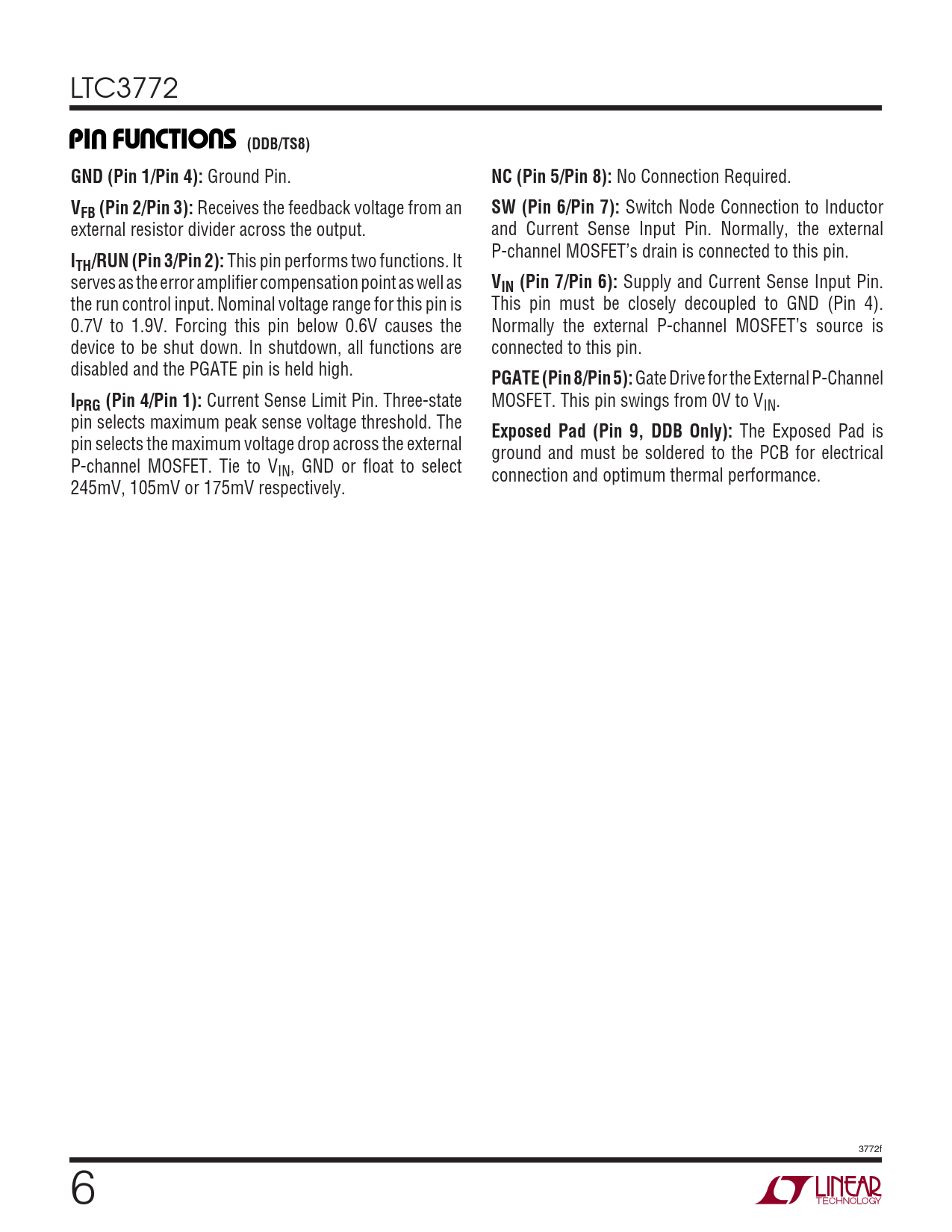 PI FU CTIO S (DDB/TS8). GND (Pin 1/Pin 4):. NC (Pin 5/Pin 8):. VFB (Pin 2/Pin 3):. SW (Pin 6/Pin 7):. ITH/RUN (Pin 3/Pin 2):
