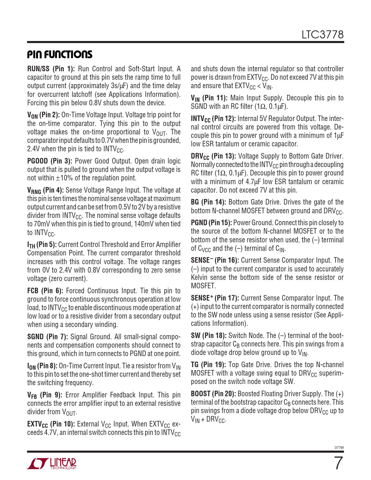 External VCC Input. When EXTVCC ex- ceeds 4.7V, an internal switch connects this pin to INTVCC 3778f 7