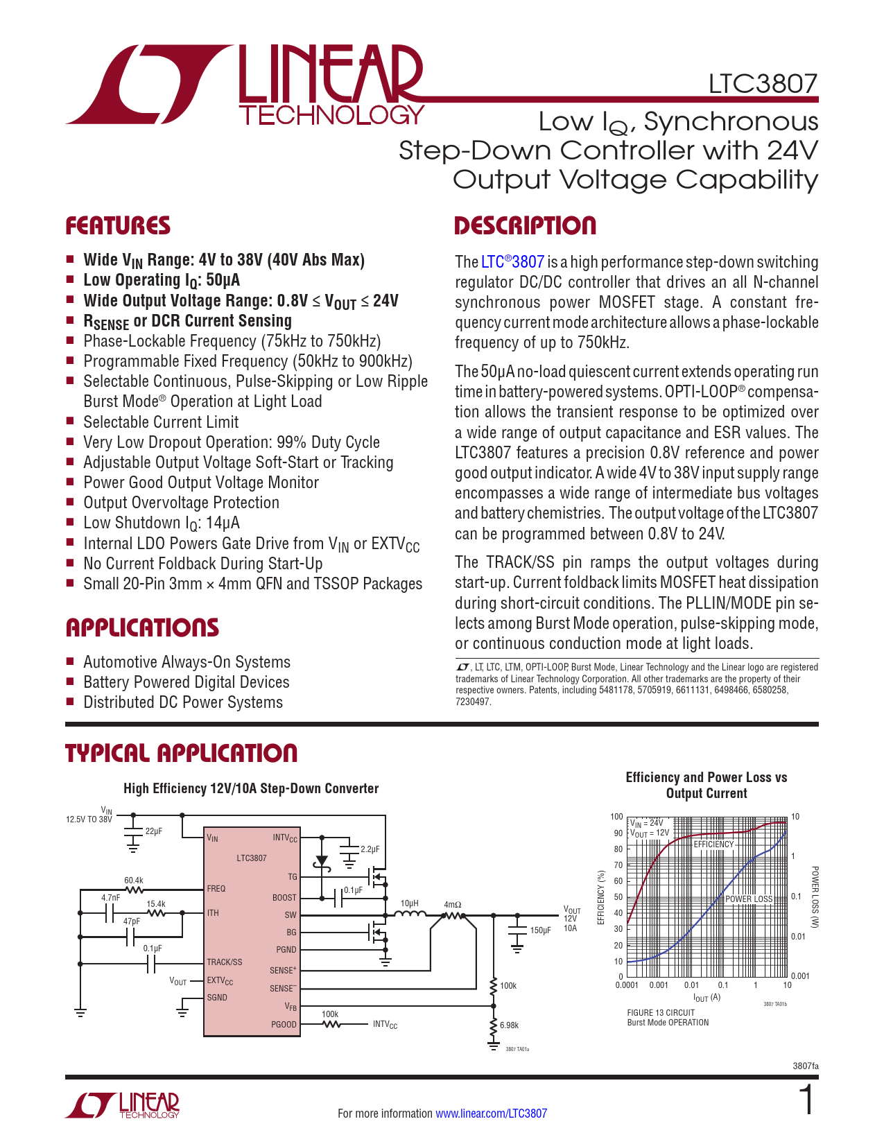 LTC3807 Low IQ, Synchronous Step-Down Controller with 24V Output Voltage Capability FEATURESDESCRIPTION n Wide VIN Range: 4V to 38V (40V Abs Max) The LTC®3807 is a high performance step-down switching n Low Operating IQ: 50μA regulator DC/DC controller that drives an all N-channel n Wide Output Voltage Range: 0.8V ≤ VOUT ≤ 24V synchronous power MOSFET stage. A constant fre- n RSENSE or DCR Current Sensing quency current mode architecture allows a phase-lockable n Phase-Lockable Frequency (75kHz to 750kHz) frequency of up to 750kHz. n Programmable Fixed Frequency (50kHz to 900kHz) The 50μA no-load quiescent current extends operating run n Selectable Continuous, Pulse-Skipping or Low Ripple time in battery-powered systems. OPTI-LOOP® compensa- Burst Mode® Operation at Light Load tion allows the transient response to be optimized over n Selectable Current Limit a wide range of output capacitance and ESR values. The n Very Low Dropout Operation: 99% Duty Cycle LTC3807 features a precision 0.8V reference and power n Adjustable Output Voltage Soft-Start or Tracking good output indicator. A wide 4V to 38V input supply range n Power Good Output Voltage Monitor encompasses a wide range of intermediate bus voltages n Output Overvoltage Protection and battery chemistries. The output voltage of the LTC3807 n Low Shutdown IQ: 14μA can be programmed between 0.8V to 24V. n Internal LDO Powers Gate Drive from VIN or EXTVCC n No Current Foldback During Start-Up The TRACK/SS pin ramps the output voltages during n Small 20-Pin 3mm × 4mm QFN and TSSOP Packages start-up. Current foldback limits MOSFET heat dissipation during short-circuit conditions. The PLLIN/MODE pin se- lects among Burst Mode operation, pulse-skipping mode, APPLICATIONS or continuous conduction mode at light loads. n Automotive Always-On Systems L, LT, LTC, LTM, OPTI-LOOP, Burst Mode, Linear Technology and the Linear logo are registered n Battery Powered Digital Devices trademarks of Linear Technology Corporation. All other trademarks are the property of their respective owners. Patents, including 5481178, 5705919, 6611131, 6498466, 6580258, n Distributed DC Power Systems 7230497. TYPICAL APPLICATIONEfficiency and Power Loss vsHigh Efficiency 12V/10A Step-Down ConverterOutput Current VIN 100 10 12.5V TO 38V VIN = 24V 22µF 90 VOUT = 12V VIN INTVCC 2.2µF 80 EFFICIENCY LTC3807 1 70 POWER LOSS (W) 60.4k TG 60 FREQ 0.1µF 4.7nF BOOST 50 0.1 POWER LOSS 15.4k 10µH 4mΩ ITH V SW OUT 40 47pF 12V EFFICIENCY (%) 150µF 10A 30 BG 0.01 20 0.1µF PGND TRACK/SS 10 SENSE+ 0 0.001 VOUT EXTVCC 100k 0.0001 0.001 0.01 0.1 1 10 SENSE– SGND IOUT (A) 3807 TA01b VFB 100k FIGURE 13 CIRCUIT PGOOD INTV Burst Mode OPERATION CC 6.98k 3807 TA01a 3807fa For more information www.linear.com/LTC3807 1 Document Outline Features Applications Description Typical Application Absolute Maximum Ratings Pin Configuration Order Information Electrical Characteristics Typical Performance Characteristics Pin Functions Functional Diagram Operation Applications Information Package Description Typical Application Related Parts Features Applications Typical Application Description Absolute Maximum Ratings Pin Configuration Order Information Electrical Characteristics Typical Performance Characteristics Pin Functions Functional Diagram Operation Applications Information Package Description Revision History Related Parts
