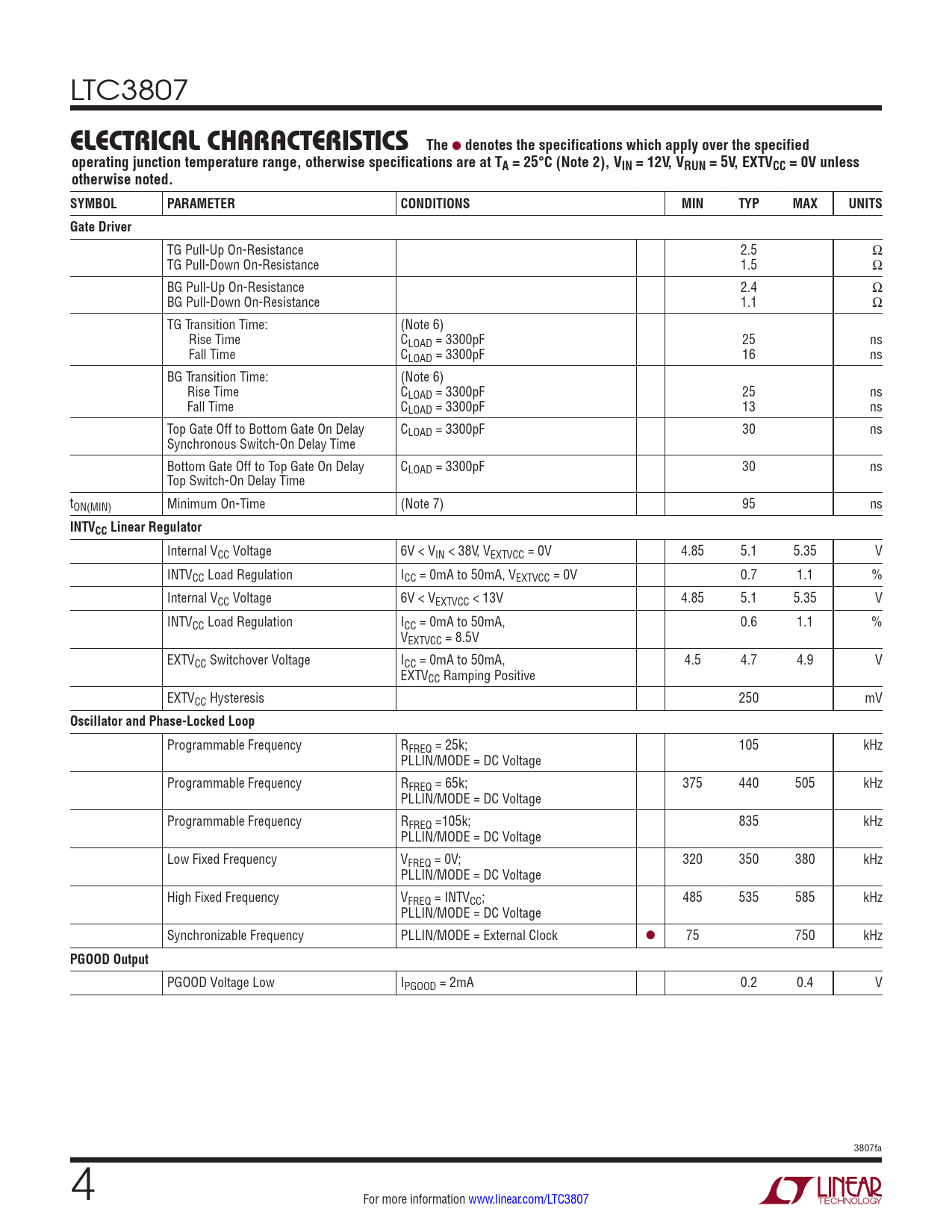 PGOOD Voltage Low IPGOOD = 2mA 0.2 0.4 V 3807fa 4 For more information www.linear.com/LTC3807 Document Outline Features Applications Description Typical Application Absolute Maximum Ratings Pin Configuration Order Information Electrical Characteristics Typical Performance Characteristics Pin Functions Functional Diagram Operation Applications Information Package Description Typical Application Related Parts Features Applications Typical Application Description Absolute Maximum Ratings Pin Configuration Order Information Electrical Characteristics Typical Performance Characteristics Pin Functions Functional Diagram Operation Applications Information Package Description Revision History Related Parts