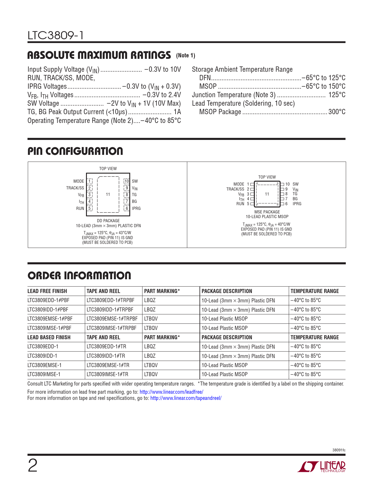 LTC3809-1 ABSOLUTE MAXIMUM RATINGS (Note 1) Input Supply Voltage (VIN) .. –0.3V to 10V Storage Ambient Temperature Range RUN, TRACK/SS, MODE, DFN ..–65°C to 125°C IPRG Voltages ... –0.3V to (VIN + 0.3V) MSOP ..–65°C to 150°C VFB, ITH Voltages .. –0.3V to 2.4V Junction Temperature (Note 3) .. 125°C SW Voltage ... –2V to VIN + 1V (10V Max) Lead Temperature (Soldering, 10 sec) TG, BG Peak Output Current (<10μs) ... 1A MSOP Package ... 300°C Operating Temperature Range (Note 2)..–40°C to 85°C PIN CONFIGURATION TOP VIEW TOP VIEW MODE 1 10 SW MODE 1 10 SW TRACK/SS 2 9 VIN TRACK/SS 2 9 VIN V 3 11 8 TG V 3 11 8 TG FB FB I 4 7 BG I 4 7 BG TH TH RUN 5 6 IPRG RUN 5 6 IPRG MSE PACKAGE 10-LEAD PLASTIC MSOP DD PACKAGE 10-LEAD (3mm s 3mm) PLASTIC DFN TJMAX = 125°C, θJA = 40°C/W EXPOSED PAD (PIN 11) IS GND TJMAX = 125°C, θJA = 43°C/W (MUST BE SOLDERED TO PCB) EXPOSED PAD (PIN 11) IS GND (MUST BE SOLDERED TO PCB) ORDER INFORMATIONLEAD FREE FINISHTAPE AND REELPART MARKING*PACKAGE DESCRIPTIONTEMPERATURE RANGE LTC3809EDD-1#PBF LTC3809EDD-1#TRPBF LBQZ 10-Lead (3mm × 3mm) Plastic DFN –40°C to 85°C LTC3809IDD-1#PBF LTC3809IDD-1#TRPBF LBQZ 10-Lead (3mm × 3mm) Plastic DFN –40°C to 85°C LTC3809EMSE-1#PBF LTC3809EMSE-1#TRPBF LTBQV 10-Lead Plastic MSOP –40°C to 85°C LTC3809IMSE-1#PBF LTC3809IMSE-1#TRPBF LTBQV 10-Lead Plastic MSOP –40°C to 85°C LEAD BASED FINISHTAPE AND REELPART MARKING*PACKAGE DESCRIPTIONTEMPERATURE RANGE LTC3809EDD-1 LTC3809EDD-1#TR LBQZ 10-Lead (3mm × 3mm) Plastic DFN –40°C to 85°C LTC3809IDD-1 LTC3809IDD-1#TR LBQZ 10-Lead (3mm × 3mm) Plastic DFN –40°C to 85°C LTC3809EMSE-1 LTC3809EMSE-1#TR LTBQV 10-Lead Plastic MSOP –40°C to 85°C LTC3809IMSE-1 LTC3809IMSE-1#TR LTBQV 10-Lead Plastic MSOP –40°C to 85°C Consult LTC Marketing for parts specifi ed with wider operating temperature ranges. *The temperature grade is identifi ed by a label on the shipping container. For more information on lead free part marking, go to: http://www.linear.com/leadfree/ For more information on tape and reel specifi cations, go to: http://www.linear.com/tapeandreel/ 38091fc 2