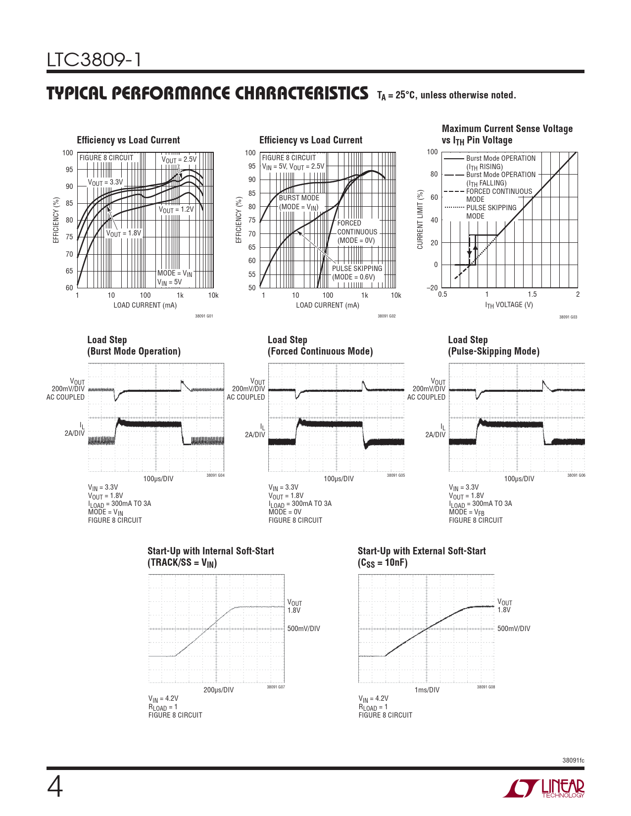 VOUT VOUT VOUT 200mV/DIV 200mV/DIV 200mV/DIV AC COUPLED AC COUPLED AC COUPLED IL IL IL 2A/DIV 2A/DIV 2A/DIV 100μs/DIV 38091 G04 100μs/DIV 38091 G05 100μs/DIV 38091 G06 VIN = 3.3V VIN = 3.3V VIN = 3.3V VOUT = 1.8V VOUT = 1.8V VOUT = 1.8V ILOAD = 300mA TO 3A ILOAD = 300mA TO 3A ILOAD = 300mA TO 3A MODE = VIN MODE = 0V MODE = VFB FIGURE 8 CIRCUIT FIGURE 8 CIRCUIT FIGURE 8 CIRCUIT