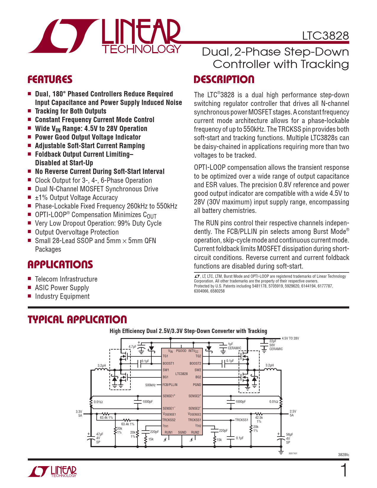 LTC3828 Dual, 2-Phase Step-Down Controller with Tracking FEATURESDESCRIPTION n Dual, 180° Phased Controllers Reduce Required The LTC®3828 is a dual high performance step-down Input Capacitance and Power Supply Induced Noise switching regulator controller that drives all N-channel n Tracking for Both Outputs synchronous power MOSFET stages. A constant frequency n Constant Frequency Current Mode Control current mode architecture allows for a phase-lockable n Wide VIN Range: 4.5V to 28V Operation frequency of up to 550kHz. The TRCKSS pin provides both n Power Good Output Voltage Indicator soft-start and tracking functions. Multiple LTC3828s can n Adjustable Soft-Start Current Ramping be daisy-chained in applications requiring more than two n Foldback Output Current Limiting– voltages to be tracked. Disabled at Start-Up OPTI-LOOP compensation allows the transient response n No Reverse Current During Soft-Start Interval to be optimized over a wide range of output capacitance n Clock Output for 3-, 4-, 6-Phase Operation and ESR values. The precision 0.8V reference and power n Dual N-Channel MOSFET Synchronous Drive good output indicator are compatible with a wide 4.5V to n ±1% Output Voltage Accuracy 28V (30V maximum) input supply range, encompassing n Phase-Lockable Fixed Frequency 260kHz to 550kHz all battery chemistries. n OPTI-LOOP® Compensation Minimizes COUT n Very Low Dropout Operation: 99% Duty Cycle The RUN pins control their respective channels indepen- n Output Overvoltage Protection dently. The FCB/PLLIN pin selects among Burst Mode® n Small 28-Lead SSOP and 5mm × 5mm QFN operation, skip-cycle mode and continuous current mode. Packages Current foldback limits MOSFET dissipation during short- circuit conditions. Reverse current and current foldback APPLICATIONS functions are disabled during soft-start. n Telecom Infrastructure L, LT, LTC, LTM, Burst Mode and OPTI-LOOP are registered trademarks of Linear Technology Corporation. All other trademarks are the property of their respective owners. n ASIC Power Supply Protected by U.S. Patents including 5481178, 5705919, 5929620, 6144194, 6177787, 6304066, 6580258 n Industry Equipment TYPICAL APPLICATIONHigh Effi ciency Dual 2.5V/3.3V Step-Down Converter with Tracking 4.5V TO 28V + 22μF 1μF 4.7μF 50V CERAMIC CERAMIC VIN PGOOD INTVCC TG1 TG2 0.1μF 0.1μF BOOST1 BOOST2 3.2μH 3.2μH SW1 SW2 LTC3828 BG1 BG2 500kHz FCB/PLLIN PGND SENSE1+ SENSE2+ 0.01Ω 1000pF 1000pF 0.01Ω SENSE1– SENSE2– 3.3V 2.5V V 5A OSENSE1 VOSENSE2 5A 63.4k 1% 42.5k TRCKSS2 TRCKSS1 TRCKSS1 1% 63.4k 1% ITH1 ITH2 20k 20k 220pF 1% 1% 220pF + RUN1 SGND RUN2 47μF 20k + 56μF 4V 1% 15k 0.1μF 4V 15k SP SP 3828 TA01 3828fc 1