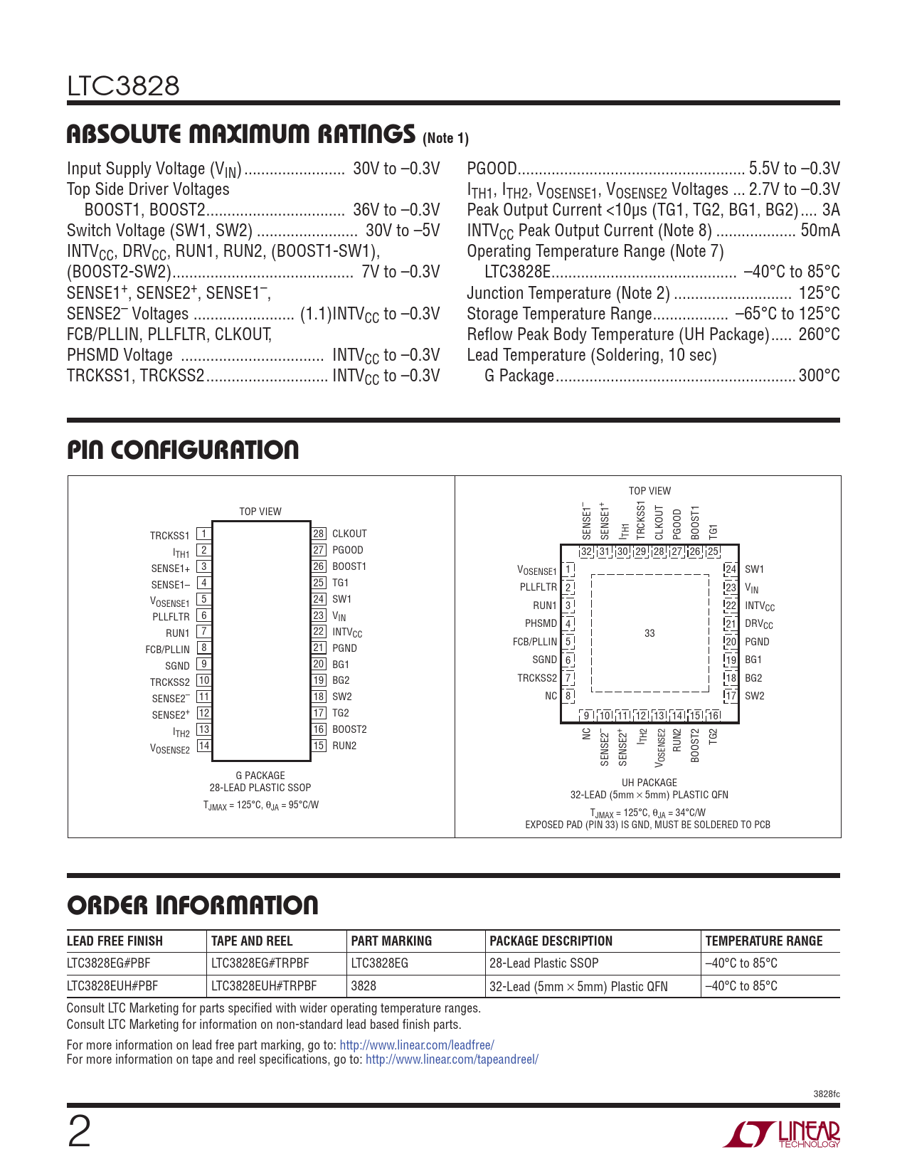LTC3828EG#PBF LTC3828EG#TRPBF LTC3828EG 28-Lead Plastic SSOP –40°C to 85°C LTC3828EUH#PBF LTC3828EUH#TRPBF 3828 32-Lead (5mm × 5mm) Plastic QFN –40°C to 85°C Consult LTC Marketing for parts specifi ed with wider operating temperature ranges. Consult LTC Marketing for information on non-standard lead based fi nish parts. For more information on lead free part marking, go to: http://www.linear.com/leadfree/ For more information on tape and reel specifi cations, go to: http://www.linear.com/tapeandreel/ 3828fc 2