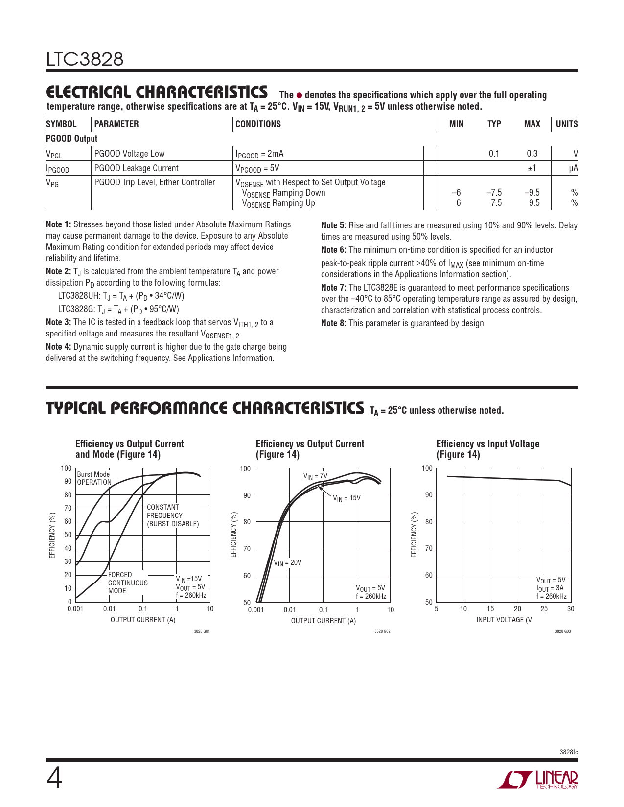 LTC3828 ELECTRICAL CHARACTERISTICSThe l denotes the specifi cations which apply over the full operatingtemperature range, otherwise specifi cations are at TA = 25°C. VIN = 15V, VRUN1, 2 = 5V unless otherwise noted.SYMBOLPARAMETERCONDITIONSMINTYPMAXUNITSPGOOD Output VPGL PGOOD Voltage Low IPGOOD = 2mA 0.1 0.3 V IPGOOD PGOOD Leakage Current VPGOOD = 5V ±1 μA VPG PGOOD Trip Level, Either Controller VOSENSE with Respect to Set Output Voltage VOSENSE Ramping Down –6 –7.5 –9.5 % VOSENSE Ramping Up 6 7.5 9.5 % Note 1: Stresses beyond those listed under Absolute Maximum Ratings Note 5: Rise and fall times are measured using 10% and 90% levels. Delay may cause permanent damage to the device. Exposure to any Absolute times are measured using 50% levels. Maximum Rating condition for extended periods may affect device Note 6: The minimum on-time condition is specifi ed for an inductor reliability and lifetime. peak-to-peak ripple current ≥40% of IMAX (see minimum on-time Note 2: TJ is calculated from the ambient temperature TA and power considerations in the Applications Information section). dissipation PD according to the following formulas: Note 7: The LTC3828E is guaranteed to meet performance specifi cations LTC3828UH: TJ = TA + (PD • 34°C/W) over the –40°C to 85°C operating temperature range as assured by design, LTC3828G: TJ = TA + (PD • 95°C/W) characterization and correlation with statistical process controls. Note 3: The IC is tested in a feedback loop that servos VITH1, 2 to a Note 8: This parameter is guaranteed by design. specifi ed voltage and measures the resultant VOSENSE1, 2. Note 4: Dynamic supply current is higher due to the gate charge being delivered at the switching frequency. See Applications Information. TYPICAL PERFORMANCE CHARACTERISTICS TA = 25°C unless otherwise noted.Effi ciency vs Output CurrentEffi ciency vs Output CurrentEffi ciency vs Input Voltageand Mode (Figure 14)(Figure 14)(Figure 14) 100 100 100 Burst Mode VIN = 7V 90 OPERATION 80 90 V 90 IN = 15V 70 CONSTANT FREQUENCY 60 (BURST DISABLE) 80 80 50 40 70 70 EFFICIENCY (%) EFFICIENCY (%) EFFICIENCY (%) 30 VIN = 20V 20 FORCED 60 V 60 CONTINUOUS IN =15V VOUT = 5V 10 V MODE OUT = 5V VOUT = 5V IOUT = 3A f = 260kHz f = 260kHz f = 260kHz 0 50 50 0.001 0.01 0.1 1 10 0.001 0.01 0.1 1 10 5 10 15 20 25 30 OUTPUT CURRENT (A) OUTPUT CURRENT (A) INPUT VOLTAGE (V 3828 G01 3828 G02 3828 G03 3828fc 4