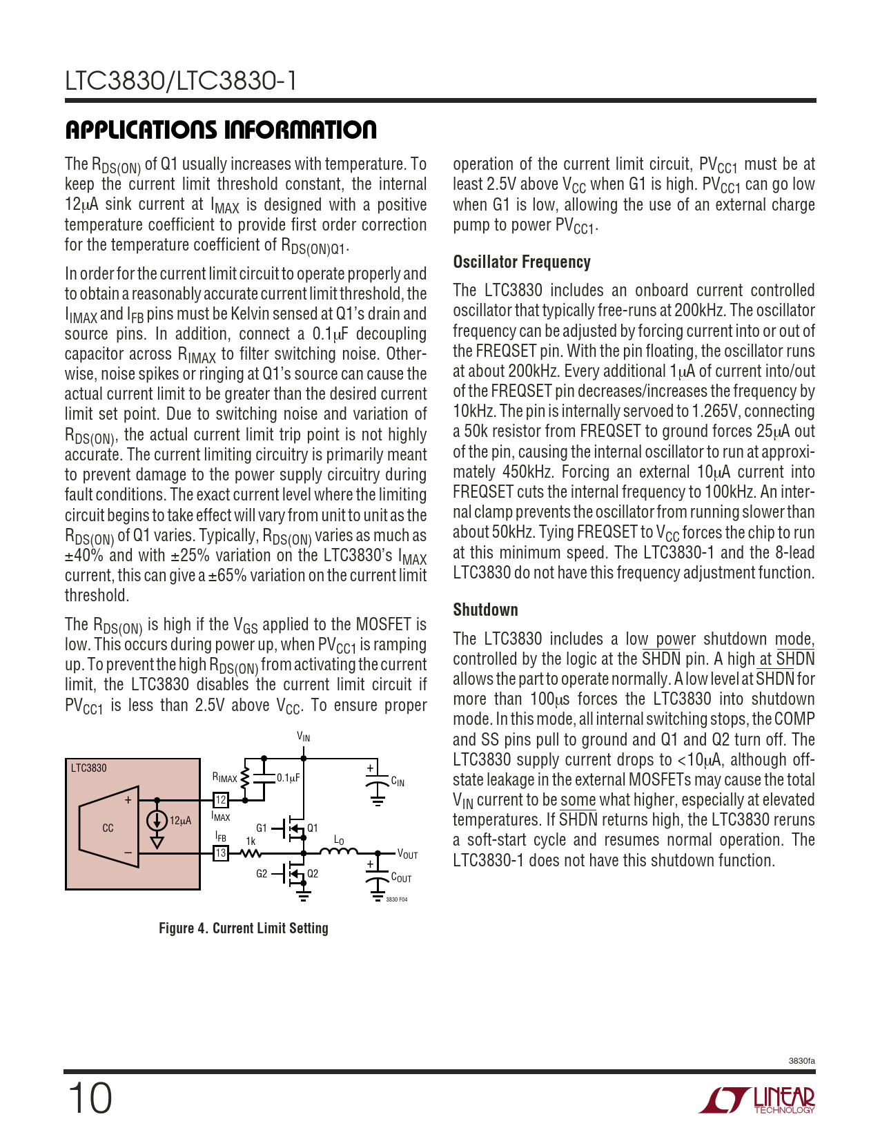 LTC3830/LTC3830-1 UUWUAPPLICATIO S I FOR ATIO The RDS(ON) of Q1 usually increases with temperature. To operation of the current limit circuit, PVCC1 must be at keep the current limit threshold constant, the internal least 2.5V above VCC when G1 is high. PVCC1 can go low 12µA sink current at IMAX is designed with a positive when G1 is low, allowing the use of an external charge temperature coefficient to provide first order correction pump to power PVCC1. for the temperature coefficient of RDS(ON)Q1. Oscillator Frequency In order for the current limit circuit to operate properly and to obtain a reasonably accurate current limit threshold, the The LTC3830 includes an onboard current controlled I oscillator that typically free-runs at 200kHz. The oscillator IMAX and IFB pins must be Kelvin sensed at Q1’s drain and source pins. In addition, connect a 0.1µF decoupling frequency can be adjusted by forcing current into or out of capacitor across R the FREQSET pin. With the pin floating, the oscillator runs IMAX to filter switching noise. Other- wise, noise spikes or ringing at Q1’s source can cause the at about 200kHz. Every additional 1µA of current into/out actual current limit to be greater than the desired current of the FREQSET pin decreases/increases the frequency by limit set point. Due to switching noise and variation of 10kHz. The pin is internally servoed to 1.265V, connecting R a 50k resistor from FREQSET to ground forces 25 DS(ON), the actual current limit trip point is not highly µA out accurate. The current limiting circuitry is primarily meant of the pin, causing the internal oscillator to run at approxi- to prevent damage to the power supply circuitry during mately 450kHz. Forcing an external 10µA current into fault conditions. The exact current level where the limiting FREQSET cuts the internal frequency to 100kHz. An inter- circuit begins to take effect will vary from unit to unit as the nal clamp prevents the oscillator from running slower than R about 50kHz. Tying FREQSET to V DS(ON) of Q1 varies. Typically, RDS(ON) varies as much as CC forces the chip to run ±40% and with ±25% variation on the LTC3830’s I at this minimum speed. The LTC3830-1 and the 8-lead MAX current, this can give a ±65% variation on the current limit LTC3830 do not have this frequency adjustment function. threshold. Shutdown The RDS(ON) is high if the VGS applied to the MOSFET is low. This occurs during power up, when PV The LTC3830 includes a low power shutdown mode, CC1 is ramping up. To prevent the high R controlled by the logic at the SHDN pin. A high at SHDN DS(ON) from activating the current limit, the LTC3830 disables the current limit circuit if allows the part to operate normally. A low level at SHDN for PV more than 100µs forces the LTC3830 into shutdown CC1 is less than 2.5V above VCC. To ensure proper mode. In this mode, all internal switching stops, the COMP VIN and SS pins pull to ground and Q1 and Q2 turn off. The LTC3830 supply current drops to <10µA, although off- LTC3830 + RIMAX 0.1µF CIN state leakage in the external MOSFETs may cause the total + 12 VIN current to be some what higher, especially at elevated I 12µA MAX temperatures. If SHDN returns high, the LTC3830 reruns CC G1 Q1 IFB 1k LO a soft-start cycle and resumes normal operation. The – 13 VOUT + LTC3830-1 does not have this shutdown function. G2 Q2 COUT 3830 F04 Figure 4. Current Limit Setting 3830fa 10
