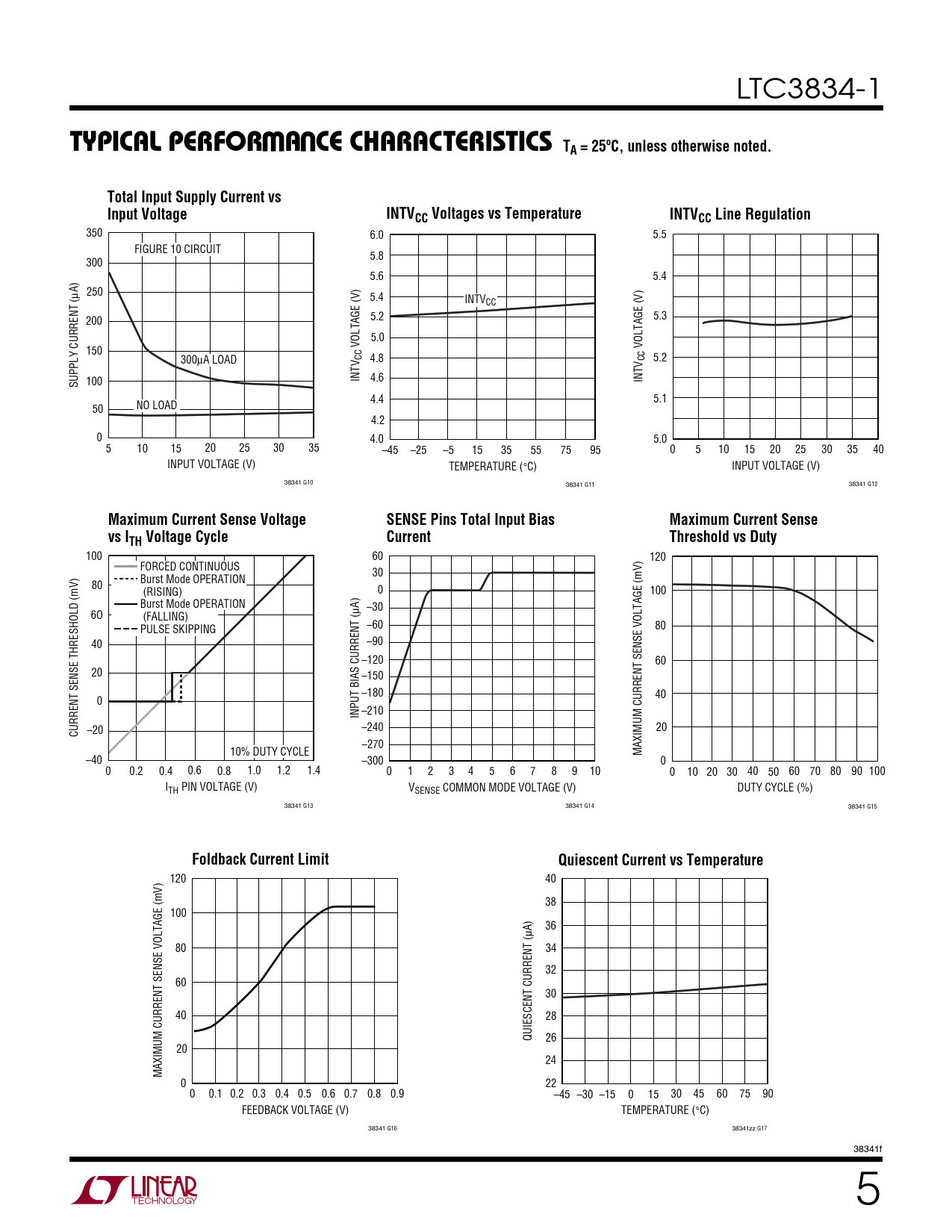 350 6.0 5.5 FIGURE 10 CIRCUIT 5.8 300 5.6 5.4 250 μA) 5.4 INTVCC 5.2 5.3 200 5.0 VOLTAGE (V) VOLTAGE (V) 150 CC 4.8 CC 300 5.2 μA LOAD 4.6 INTV INTV 100 SUPPLY CURRENT ( 4.4 5.1 50 NO LOAD 4.2 0 4.0 5.0 5 10 15 20 25 30 35 –45 –25 –5 15 35 55 75 95 0 5 10 15 20 25 30 35 40 INPUT VOLTAGE (V) TEMPERATURE (°C) INPUT VOLTAGE (V) 38341 G10 38341 G11 38341 G12