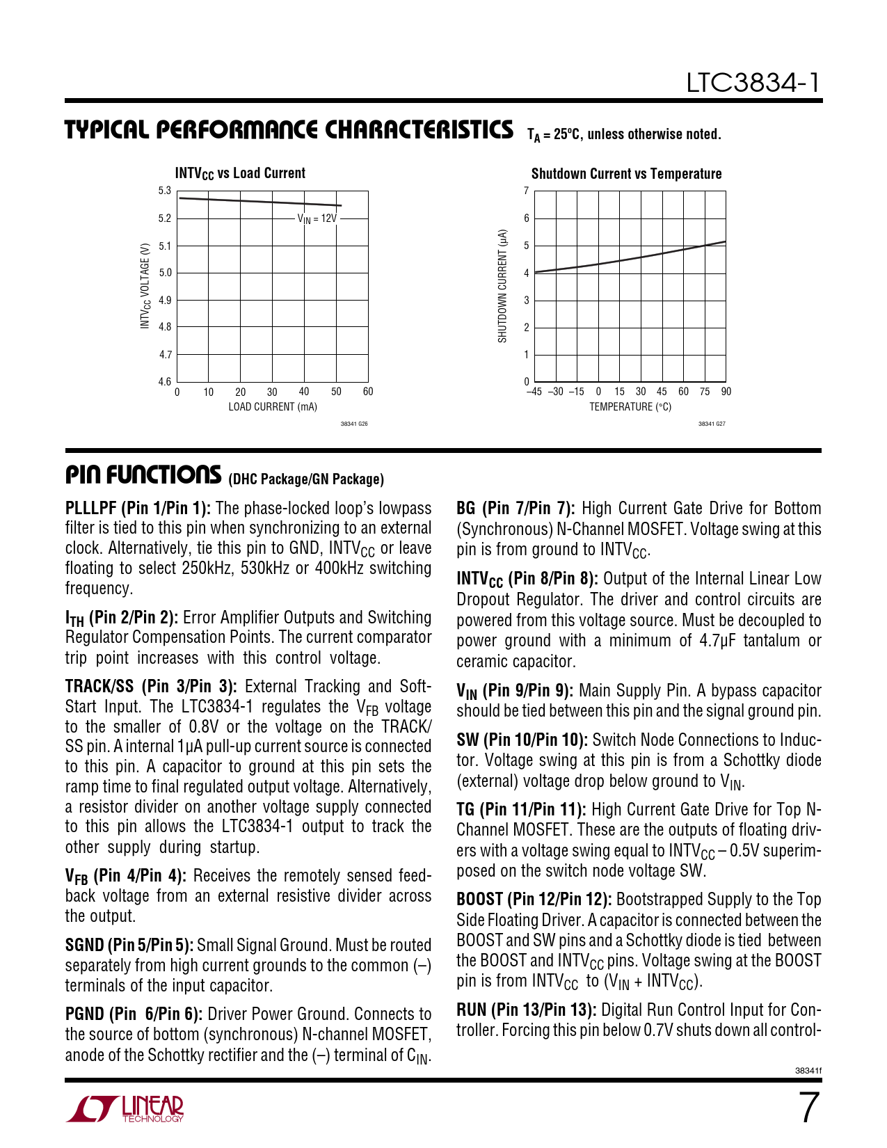 5.3 7 5.2 V 6 IN = 12V μA) 5.1 5 5.0 4 VOLTAGE (V) 4.9 3 CC INTV 4.8 2 SHUTDOWN CURRENT ( 4.7 1 4.6 0 0 10 20 30 40 50 60 –45 –30 –15 0 15 30 45 60 75 90 LOAD CURRENT (mA) TEMPERATURE (°C) 38341 G26 38341 G27