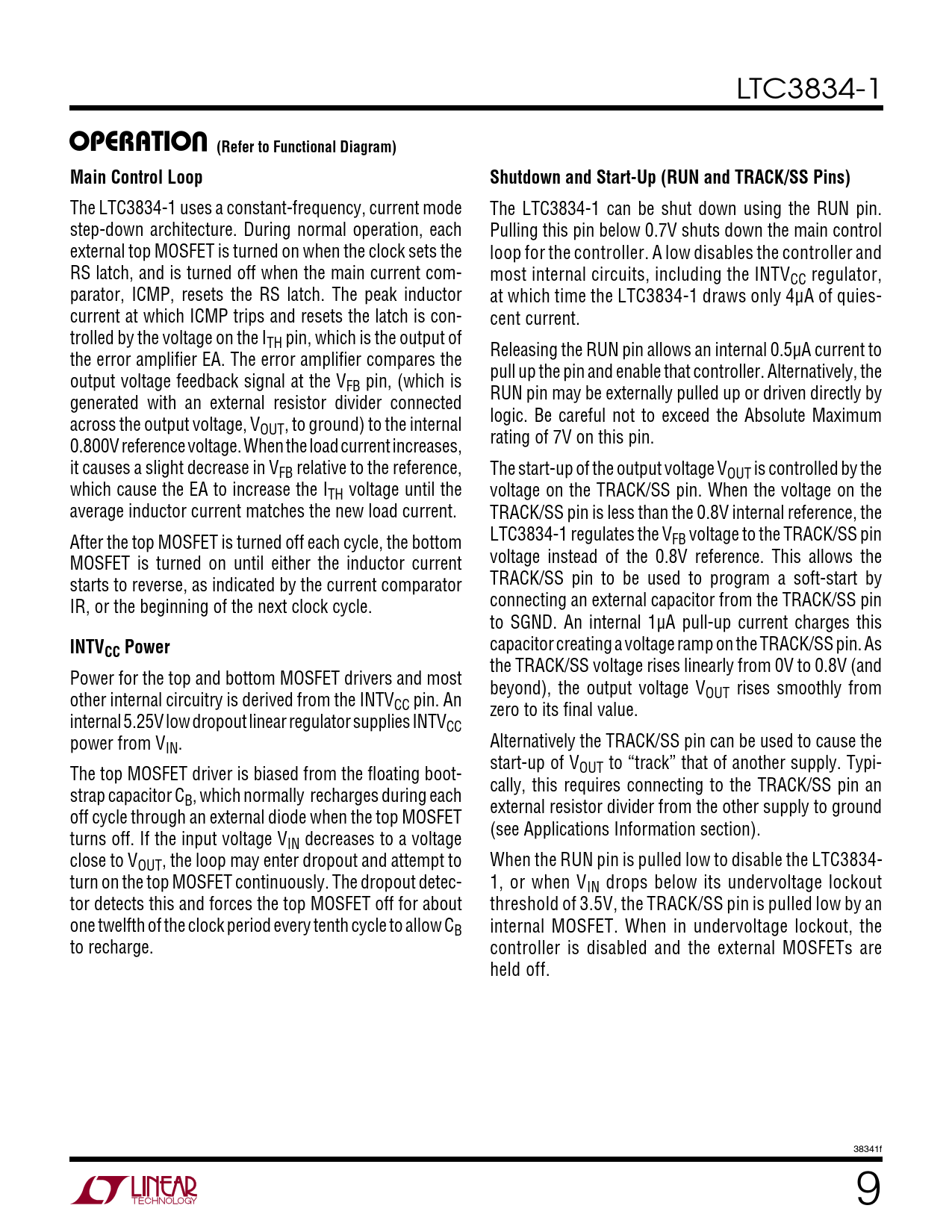 OPERATIO (Refer to Functional Diagram). Main Control Loop. Shutdown and Start-Up (RUN and TRACK/SS Pins). INTV. CC Power