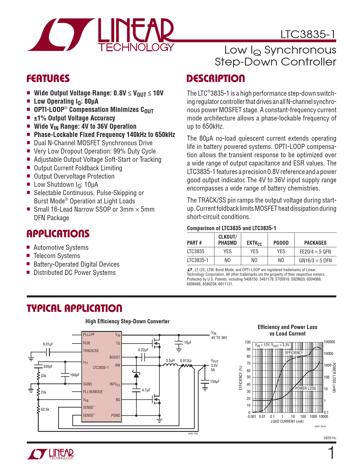 Automotive Systems LTC3835 YES YES YES FE20/4 × 5 QFN n Telecom Systems LTC3835-1 NO NO NO n GN16/3 × 5 DFN Battery-Operated Digital Devices L, LT, LTC, LTM, Burst Mode, and OPTI-LOOP are registered trademarks of Linear n Distributed DC Power Systems Technology Corporation. All other trademarks are the property of their respective owners. Protected by U.S. Patents, including 5408150, 5481178, 5705919, 5929620, 6304066, 6498466, 6580258, 6611131.