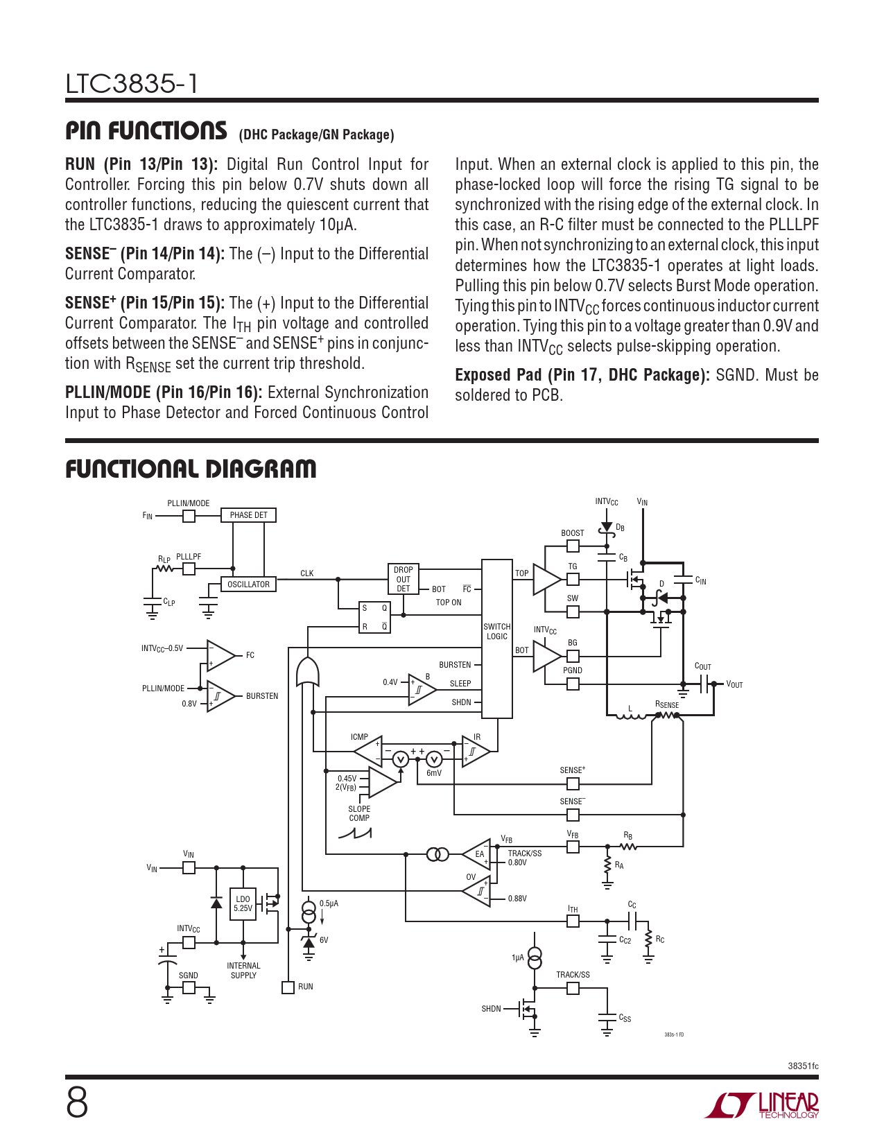 INTV PLLIN/MODE CC VIN FIN PHASE DET DB BOOST R PLLLPF C LP B TG CLK DROP TOP OUT CIN OSCILLATOR D DET BOT FC C SW LP TOP ON S Q R Q SWITCH INTVCC LOGIC BG INTVCC–0.5V – BOT FC + BURSTEN C PGND OUT B 0.4V + SLEEP V PLLIN/MODE – OUT BURSTEN – 0.8V + SHDN RSENSE L ICMP IR + – – + + – – + 6mV SENSE+ 0.45V 2(VFB) SENSE– SLOPE COMP VFB RB VFB – VIN EA TRACK/SS + 0.80V V R IN A OV + LDO – 0.88V 0.5μA C 5.25V I C TH INTVCC 6V C R C2 C + 1μA INTERNAL SGND SUPPLY TRACK/SS RUN SHDN CSS 3835-1 FD 38351fc 8