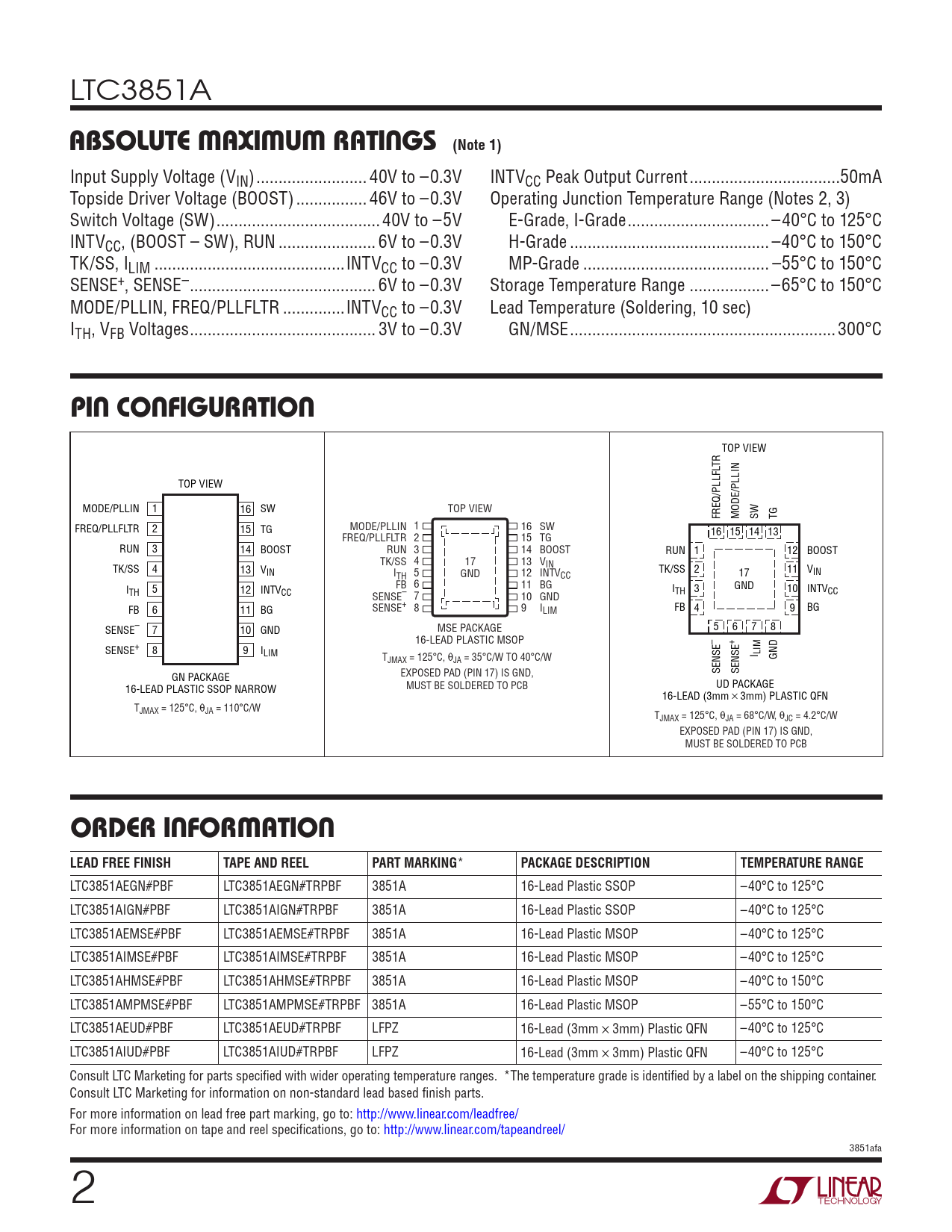 TOP VIEW TR TOP VIEW MODE/PLLIN 1 16 SW TOP VIEW FREQ/PLLFL MODE/PLLIN SW TG FREQ/PLLFLTR 2 15 TG MODE/PLLIN 1 16 SW FREQ/PLLFLTR 2 15 TG 16 15 14 13 RUN 3 14 BOOST RUN 3 14 BOOST RUN 1 12 BOOST TK/SS 4 17 13 V TK/SS 4 13 V IN IN I 5 TK/SS 2 11 V TH GND 12 INTVCC 17 IN I FB 6 11 BG GND TH 5 12 INTVCC ITH 3 10 INTV SENSE– 7 10 GND CC FB 6 11 BG SENSE+ 8 9 ILIM FB 4 9 BG SENSE– 7 10 GND MSE PACKAGE 5 6 7 8 16-LEAD PLASTIC MSOP – + SENSE+ 8 9 I LIM T I LIM JMAX = 125°C, θJA = 35°C/W TO 40°C/W GND SENSE SENSE GN PACKAGE EXPOSED PAD (PIN 17) IS GND, 16-LEAD PLASTIC SSOP NARROW MUST BE SOLDERED TO PCB UD PACKAGE 16-LEAD (3mm × 3mm) PLASTIC QFN T JMAX = 125°C, θJA = 110°C/W TJMAX = 125°C, θJA = 68°C/W, θJC = 4.2°C/W EXPOSED PAD (PIN 17) IS GND, MUST BE SOLDERED TO PCB