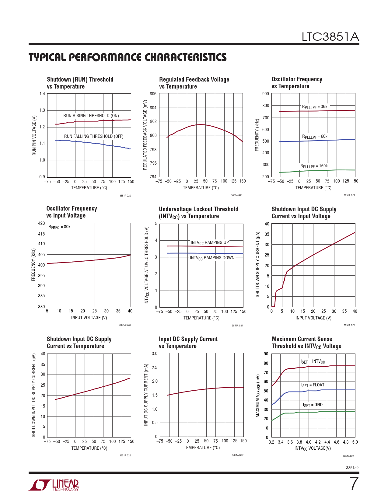 420 5 40 RFREQ = 80k 415 35 4 410 INTVCC RAMPING UP 30 405 25 3 INTVCC RAMPING DOWN 400 20 395 2 15 FREQUENCY (kHz) 390 10 VOLTAGE AT UVLO THRESHOLD (V) 1 385 CC SHUTDOWN SUPPLY CURRENT (µA) 5 INTV 380 0 0 5 10 15 20 25 30 35 40 –75 –50 –25 0 25 50 75 100 125 150 0 5 10 15 20 25 30 35 40 INPUT VOLTAGE (V) TEMPERATURE (°C) INPUT VOLTAGE (V) 3851A G23 3851A G24 3851A G25