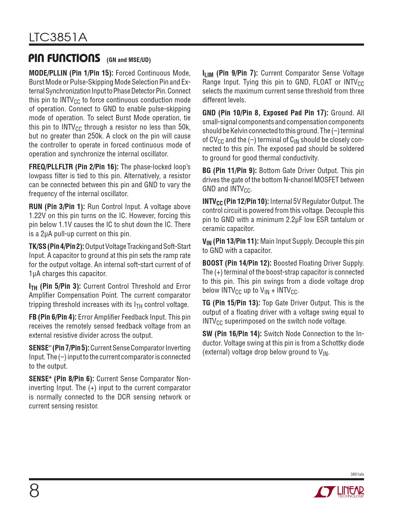 LTC3851A pin FuncTions (GN and MSE/UD)MODE/PLLIN (Pin 1/Pin 15): Forced Continuous Mode, ILIM (Pin 9/Pin 7): Current Comparator Sense Voltage Burst Mode or Pulse-Skipping Mode Selection Pin and Ex- Range Input. Tying this pin to GND, FLOAT or INTVCC ternal Synchronization Input to Phase Detector Pin. Connect selects the maximum current sense threshold from three this pin to INTVCC to force continuous conduction mode dif ferent levels. of operation. Connect to GND to enable pulse-skipping GND (Pin 10/Pin 8, Exposed Pad Pin 17): Ground. All mode of operation. To select Burst Mode operation, tie small-signal components and compensation components this pin to INTVCC through a resistor no less than 50k, should be Kelvin connected to this ground. The (–) terminal but no greater than 250k. A clock on the pin will cause of CV the controller to operate in forced continuous mode of CC and the (–) terminal of CIN should be closely con- nected to this pin. The exposed pad should be soldered operation and synchronize the internal oscillator. to ground for good thermal conductivity. FREQ/PLLFLTR (Pin 2/Pin 16): The phase-locked loop’s BG (Pin 11/Pin 9): Bottom Gate Driver Output. This pin lowpass filter is tied to this pin. Alternatively, a resistor drives the gate of the bottom N-channel MOSFET between can be connected between this pin and GND to vary the GND and INTV frequency of the internal oscillator. CC. INTVRUN (Pin 3/Pin 1): Run Control Input. A voltage above CC (Pin 12/Pin 10): Internal 5V Regulator Output. The control circuit is powered from this voltage. Decouple this 1.22V on this pin turns on the IC. However, forcing this pin to GND with a minimum 2.2μF low ESR tantalum or pin below 1.1V causes the IC to shut down the IC. There ceramic capacitor. is a 2μA pull-up current on this pin. VTK/SS (Pin 4/Pin 2): Output Voltage Tracking and Soft-Start IN (Pin 13/Pin 11): Main Input Supply. Decouple this pin to GND with a capacitor. Input. A capacitor to ground at this pin sets the ramp rate for the output voltage. An internal soft-start current of of BOOST (Pin 14/Pin 12): Boosted Floating Driver Supply. 1μA charges this capacitor. The (+) terminal of the boost-strap capacitor is connected to this pin. This pin swings from a diode voltage drop ITH (Pin 5/Pin 3): Current Control Threshold and Error below INTV Amplifier Compensation Point. The current comparator CC up to VIN + INTVCC. tripping threshold increases with its ITH control voltage. TG (Pin 15/Pin 13): Top Gate Driver Output. This is the output of a floating driver with a voltage swing equal to FB (Pin 6/Pin 4): Error Amplifier Feedback Input. This pin INTV receives the remotely sensed feedback voltage from an CC superimposed on the switch node voltage. external resistive divider across the output. SW (Pin 16/Pin 14): Switch Node Connection to the In- ductor. Voltage swing at this pin is from a Schottky diode SENSE– (Pin 7/Pin 5): Current Sense Comparator Inverting (external) voltage drop below ground to V Input. The (–) input to the current comparator is connected IN. to the output. SENSE+ (Pin 8/Pin 6): Current Sense Comparator Non- inverting Input. The (+) input to the current comparator is normally connected to the DCR sensing network or current sensing resistor. 3851afa 8 Document Outline Features Applications Description Typical Application Absolute Maximum Ratings Pin Configuration Order Information Electrical Characteristics Typical Performance Characteristics Pin Functions Functional Diagram Operation Applications Information Typical Applications Package Description Revision History Typical Application Related Parts