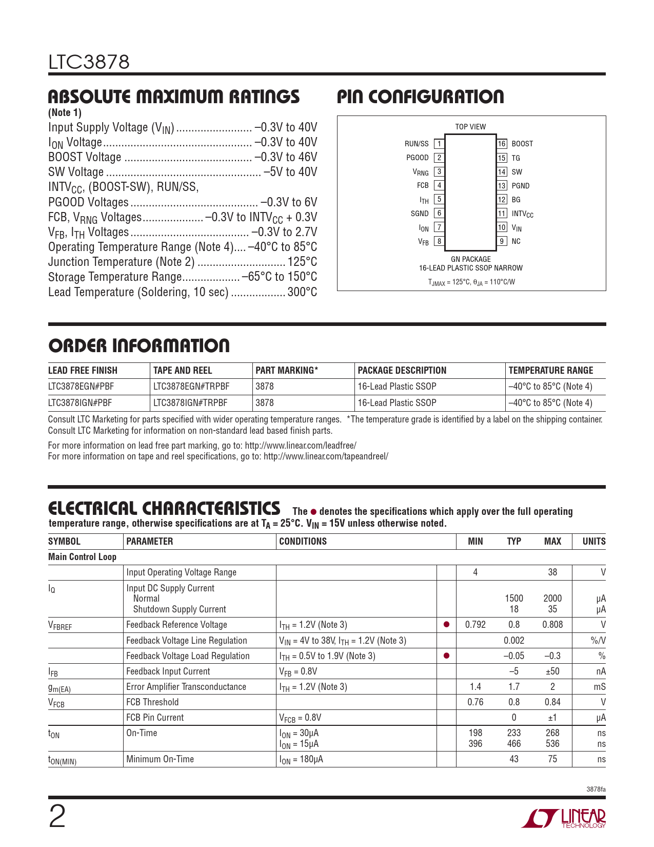 LTC3878EGN#PBF LTC3878EGN#TRPBF 3878 16-Lead Plastic SSOP –40°C to 85°C (Note 4) LTC3878IGN#PBF LTC3878IGN#TRPBF 3878 16-Lead Plastic SSOP –40°C to 85°C (Note 4) Consult LTC Marketing for parts specified with wider operating temperature ranges. *The temperature grade is identified by a label on the shipping container. Consult LTC Marketing for information on non-standard lead based finish parts. For more information on lead free part marking, go to: http://www.linear.com/leadfree/ For more information on tape and reel specifications, go to: http://www.linear.com/tapeandreel/ e