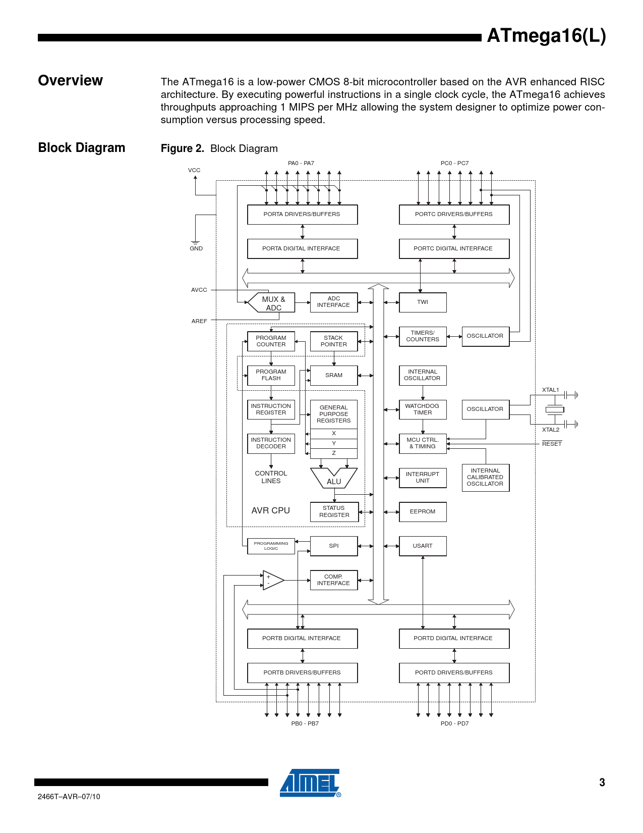 ATmega16(L)Overview The ATmega16 is a low-power CMOS 8-bit microcontroller based on the AVR enhanced RISC architecture. By executing powerful instructions in a single clock cycle, the ATmega16 achieves throughputs approaching 1 MIPS per MHz allowing the system designer to optimize power con- sumption versus processing speed. Block DiagramFigure 2. Block Diagram PA0 - PA7 PC0 - PC7 VCC PORTA DRIVERS/BUFFERS PORTC DRIVERS/BUFFERS GND PORTA DIGITAL INTERFACE PORTC DIGITAL INTERFACE AVCC ADC MUX & TWI INTERFACE ADC AREF TIMERS/ OSCILLATOR PROGRAM STACK COUNTERS COUNTER POINTER PROGRAM INTERNAL SRAM FLASH OSCILLATOR XTAL1 INSTRUCTION WATCHDOG GENERAL OSCILLATOR REGISTER TIMER PURPOSE REGISTERS XTAL2 X INSTRUCTION MCU CTRL. Y RESET DECODER & TIMING Z CONTROL INTERNAL INTERRUPT CALIBRATED LINES UNIT ALU OSCILLATOR STATUS AVR CPU EEPROM REGISTER PROGRAMMING SPI USART LOGIC + COMP. - INTERFACE PORTB DIGITAL INTERFACE PORTD DIGITAL INTERFACE PORTB DRIVERS/BUFFERS PORTD DRIVERS/BUFFERS PB0 - PB7 PD0 - PD7 3 2466T–AVR–07/10 Document Outline Features Pin Configurations Disclaimer Overview Block Diagram Pin Descriptions VCC GND Port A (PA7..PA0) Port B (PB7..PB0) Port C (PC7..PC0) Port D (PD7..PD0) RESET XTAL1 XTAL2 AVCC AREF Resources Data Retention About Code Examples AVR CPU Core Introduction Architectural Overview ALU – Arithmetic Logic Unit Status Register General Purpose Register File The X-register, Y- register and Z-register Stack Pointer Instruction Execution Timing Reset and Interrupt Handling Interrupt Response Time AVR ATmega16 Memories In-System Reprogrammable Flash Program Memory SRAM Data Memory Data Memory Access Times EEPROM Data Memory EEPROM Read/Write Access The EEPROM Address Register – EEARH and EEARL The EEPROM Data Register – EEDR The EEPROM Control Register – EECR EEPROM Write During Power-down Sleep Mode Preventing EEPROM Corruption I/O Memory System Clock and Clock Options Clock Systems and their Distribution CPU Clock – clkCPU I/O Clock – clkI/O Flash Clock – clkFLASH Asynchronous Timer Clock – clkASY ADC Clock – clkADC Clock Sources Default Clock Source Crystal Oscillator Low-frequency Crystal Oscillator External RC Oscillator Calibrated Internal RC Oscillator Oscillator Calibration Register – OSCCAL External Clock Timer/Counter Oscillator Power Management and Sleep Modes MCU Control Register – MCUCR Idle Mode ADC Noise Reduction Mode Power-down Mode Power-save Mode Standby Mode Extended Standby Mode Minimizing Power Consumption Analog to Digital Converter Analog Comparator Brown-out Detector Internal Voltage Reference Watchdog Timer Port Pins JTAG Interface and On-chip Debug System System Control and Reset Resetting the AVR Reset Sources Power-on Reset External Reset Brown-out Detection Watchdog Reset MCU Control and Status Register – MCUCSR Internal Voltage Reference Voltage Reference Enable Signals and Start-up Time Watchdog Timer Watchdog Timer Control Register – WDTCR Interrupts Interrupt Vectors in ATmega16 Moving Interrupts Between Application and Boot Space General Interrupt Control Register – GICR I/O Ports Introduction Ports as General Digital I/O Configuring the Pin Reading the Pin Value Digital Input Enable and Sleep Modes Unconnected pins Alternate Port Functions Special Function I/O Register – SFIOR Alternate Functions of Port A Alternate Functions of Port B Alternate Functions of Port C Alternate Functions of Port D Register Description for I/O Ports Port A Data Register – PORTA Port A Data Direction Register – DDRA Port A Input Pins Address – PINA Port B Data Register – PORTB Port B Data Direction Register – DDRB Port B Input Pins Address – PINB Port C Data Register – PORTC Port C Data Direction Register – DDRC Port C Input Pins Address – PINC Port D Data Register – PORTD Port D Data Direction Register – DDRD Port D Input Pins Address – PIND External Interrupts MCU Control Register – MCUCR MCU Control and Status Register – MCUCSR General Interrupt Control Register – GICR General Interrupt Flag Register – GIFR 8-bit Timer/Counter0 with PWM Overview Registers Definitions Timer/Counter Clock Sources Counter Unit Output Compare Unit Force Output Compare Compare Match Blocking by TCNT0 Write Using the Output Compare Unit Compare Match Output Unit Compare Output Mode and Waveform Generation Modes of Operation Normal Mode Clear Timer on Compare Match (CTC) Mode Fast PWM Mode Phase Correct PWM Mode Timer/Counter Timing Diagrams 8-bit Timer/Counter Register Description Timer/Counter Control Register – TCCR0 Timer/Counter Register – TCNT0 Output Compare Register – OCR0 Timer/Counter Interrupt Mask Register – TIMSK Timer/Counter Interrupt Flag Register – TIFR Timer/Counter0 and Timer/Counter1 Prescalers Internal Clock Source Prescaler Reset External Clock Source Special Function IO Register – SFIOR 16-bit Timer/Counter1 Overview Registers Definitions Compatibility Accessing 16-bit Registers Reusing the Temporary High Byte Register Timer/Counter Clock Sources Counter Unit Input Capture Unit Input Capture Pin Source Noise Canceler Using the Input Capture Unit Output Compare Units Force Output Compare Compare Match Blocking by TCNT1 Write Using the Output Compare Unit Compare Match Output Unit Compare Output Mode and Waveform Generation Modes of Operation Normal Mode Clear Timer on Compare Match (CTC) Mode Fast PWM Mode Phase Correct PWM Mode Phase and Frequency Correct PWM Mode Timer/Counter Timing Diagrams 16-bit Timer/Counter Register Description Timer/Counter1 Control Register A – TCCR1A Timer/Counter1 Control Register B – TCCR1B Timer/Counter1 – TCNT1H and TCNT1L Output Compare Register 1 A – OCR1AH and OCR1AL Output Compare Register 1 B – OCR1BH and OCR1BL Input Capture Register 1 – ICR1H and ICR1L Timer/Counter Interrupt Mask Register – TIMSK(1) Timer/Counter Interrupt Flag Register – TIFR 8-bit Timer/Counter2 with PWM and Asynchronous Operation Overview Registers Definit