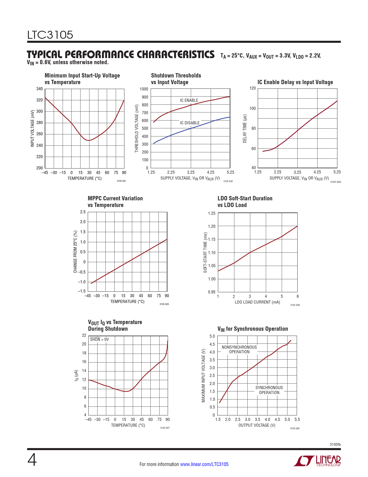 340 1000 120 900 320 IC ENABLE 800 100 300 700 280 600 IC DISABLE 500 80 260 Y TIME (µs) 400 DELA INPUT VOLTAGE (mV) 240 300 60 THRESHOLD VOLTAGE (mV) 200 220 100 200 0 40 –45 –30 –15 0 15 30 45 60 75 90 1.25 2.25 3.25 4.25 5.25 1.25 2.25 3.25 4.25 5.25 TEMPERATURE (°C) SUPPLY VOLTAGE, VIN OR VAUX (V) SUPPLY VOLTAGE, VIN OR VAUX (V) 3105 G01 3105 G02 3105 G03
