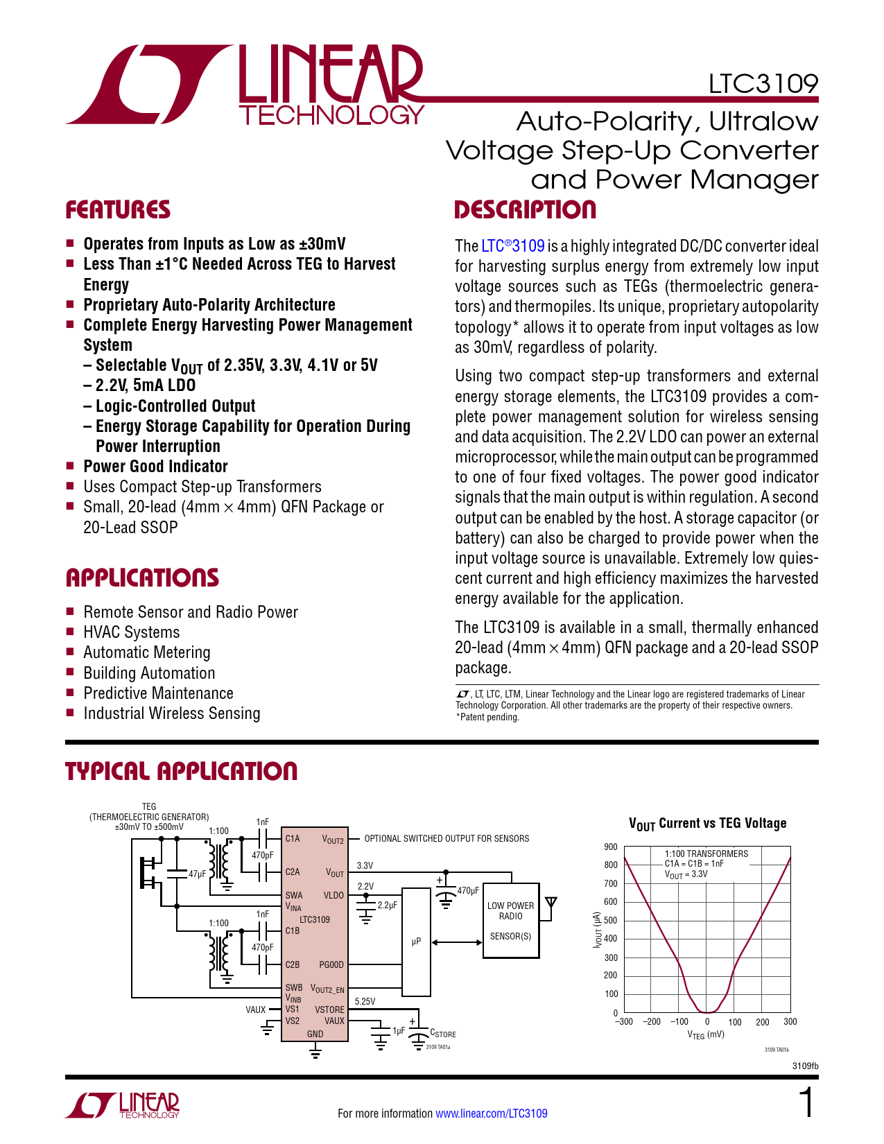 LTC3109 Auto-Polarity, Ultralow Voltage Step-Up Converter and Power Manager FeaTuresDescripTion n Operates from Inputs as Low as ±30mV The LTC®3109 is a highly integrated DC/DC converter ideal n Less Than ±1°C Needed Across TEG to Harvest for harvesting surplus energy from extremely low input Energy voltage sources such as TEGs (thermoelectric genera- n Proprietary Auto-Polarity Architecture tors) and thermopiles. Its unique, proprietary autopolarity n Complete Energy Harvesting Power Management topology* allows it to operate from input voltages as low System as 30mV, regardless of polarity. – Selectable VOUT of 2.35V, 3.3V, 4.1V or 5V Using two compact step-up transformers and external – 2.2V, 5mA LDO energy storage elements, the LTC3109 provides a com- – Logic-Controlled Output plete power management solution for wireless sensing – Energy Storage Capability for Operation During and data acquisition. The 2.2V LDO can power an external Power Interruption microprocessor, while the main output can be programmed n Power Good Indicator to one of four fixed voltages. The power good indicator n Uses Compact Step-up Transformers signals that the main output is within regulation. A second n Small, 20-lead (4mm × 4mm) QFN Package or output can be enabled by the host. A storage capacitor (or 20-Lead SSOP battery) can also be charged to provide power when the input voltage source is unavailable. Extremely low quies- applicaTions cent current and high efficiency maximizes the harvested energy available for the application. n Remote Sensor and Radio Power n The LTC3109 is available in a small, thermally enhanced HVAC Systems n 20-lead (4mm × 4mm) QFN package and a 20-lead SSOP Automatic Metering n package. Building Automation n Predictive Maintenance L, LT, LTC, LTM, Linear Technology and the Linear logo are registered trademarks of Linear Technology Corporation. All other trademarks are the property of their respective owners. n Industrial Wireless Sensing *Patent pending. Typical applicaTion TEG (THERMOELECTRIC GENERATOR) 1nF ±30mV TO ±500mV VOUT Current vs TEG Voltage 1:100 C1A • • VOUT2 OPTIONAL SWITCHED OUTPUT FOR SENSORS 900 470pF 1:100 TRANSFORMERS 3.3V 800 C1A = C1B = 1nF 47µF C2A VOUT + VOUT = 3.3V 2.2V 700 SWA VLDO 470µF V 2.2µF 600 INA LOW POWER 1nF LTC3109 RADIO 1:100 (µA) 500 • • C1B µP SENSOR(S) 400 470pF I VOUT 300 C2B PG00D 200 SWB VOUT2_EN V 100 INB 5.25V VAUX VS1 VSTORE 0 VS2 VAUX + –300 –200 –100 0 100 200 300 GND 1µF CSTORE VTEG (mV) 3109 TA01a 3109 TA01b 3109fb For more information www.linear.com/LTC3109 1 Document Outline Features Applications Description Typical Application Absolute Maximum Ratings Pin Configuration Order Information Electrical Characteristics Typical Performance Characteristics Pin Functions Block Diagram Operation Applications Information Package Description Typical Application Related Parts