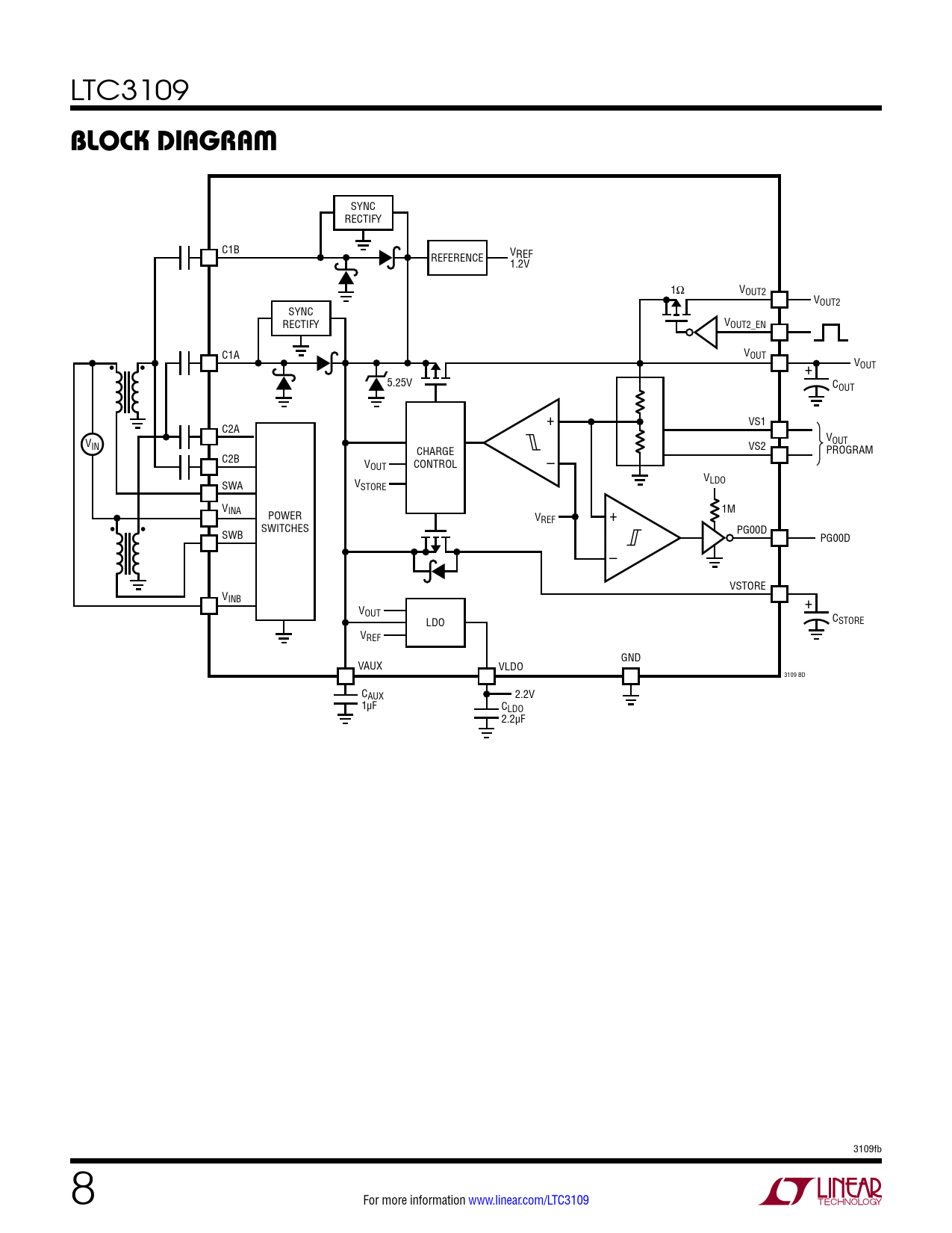 SYNC RECTIFY C1B VREF REFERENCE 1.2V 1Ω VOUT2 VOUT2 SYNC RECTIFY VOUT2_EN C1A VOUT VOUT • • + 5.25V COUT + VS1 C2A VOUT VIN VS2 CHARGE PROGRAM C2B VOUT CONTROL – VLDO SWA VSTORE VINA 1M POWER VREF + • • SWITCHES PG00D SWB PG00D – VSTORE VINB + VOUT LDO CSTORE VREF GND VAUX VLDO 3109 BD CAUX 2.2V 1µF CLDO 2.2µF 3109fb 8 For more information www.linear.com/LTC3109 Document Outline Features Applications Description Typical Application Absolute Maximum Ratings Pin Configuration Order Information Electrical Characteristics Typical Performance Characteristics Pin Functions Block Diagram Operation Applications Information Package Description Typical Application Related Parts