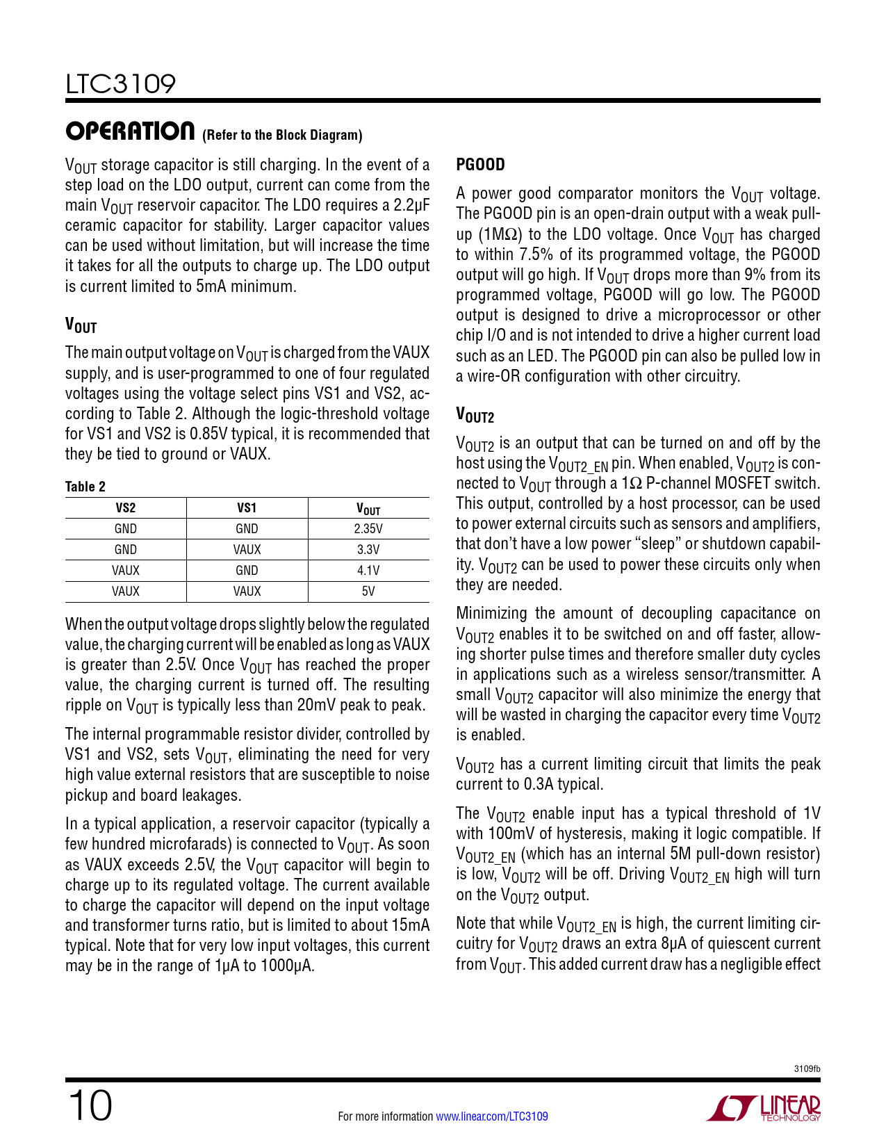 LTC3109 operaTion (Refer to the Block Diagram) VOUT storage capacitor is still charging. In the event of a PGOOD step load on the LDO output, current can come from the A power good comparator monitors the V main V OUT voltage. OUT reservoir capacitor. The LDO requires a 2.2µF The PGOOD pin is an open-drain output with a weak pull- ceramic capacitor for stability. Larger capacitor values up (1MΩ) to the LDO voltage. Once V can be used without limitation, but will increase the time OUT has charged to within 7.5% of its programmed voltage, the PGOOD it takes for all the outputs to charge up. The LDO output output will go high. If V is current limited to 5mA minimum. OUT drops more than 9% from its programmed voltage, PGOOD will go low. The PGOOD V output is designed to drive a microprocessor or other OUT chip I/O and is not intended to drive a higher current load The main output voltage on VOUT is charged from the VAUX such as an LED. The PGOOD pin can also be pulled low in supply, and is user-programmed to one of four regulated a wire-OR configuration with other circuitry. voltages using the voltage select pins VS1 and VS2, ac- cording to Table 2. Although the logic-threshold voltage VOUT2 for VS1 and VS2 is 0.85V typical, it is recommended that V they be tied to ground or VAUX. OUT2 is an output that can be turned on and off by the host using the VOUT2_EN pin. When enabled, VOUT2 is con- Table 2 nected to VOUT through a 1Ω P-channel MOSFET switch. VS2VS1V This output, controlled by a host processor, can be used OUT GND GND 2.35V to power external circuits such as sensors and amplifiers, GND VAUX 3.3V that don’t have a low power “sleep” or shutdown capabil- VAUX GND 4.1V ity. VOUT2 can be used to power these circuits only when VAUX VAUX 5V they are needed. When the output voltage drops slightly below the regulated Minimizing the amount of decoupling capacitance on value, the charging current will be enabled as long as VAUX VOUT2 enables it to be switched on and off faster, allow- is greater than 2.5V. Once V ing shorter pulse times and therefore smaller duty cycles OUT has reached the proper value, the charging current is turned off. The resulting in applications such as a wireless sensor/transmitter. A ripple on V small VOUT2 capacitor will also minimize the energy that OUT is typically less than 20mV peak to peak . will be wasted in charging the capacitor every time VOUT2 The internal programmable resistor divider, controlled by is enabled. VS1 and VS2, sets VOUT , eliminating the need for very high value external resistors that are susceptible to noise VOUT2 has a current limiting circuit that limits the peak pickup and board leakages. current to 0.3A typical. In a typical application, a reservoir capacitor (typically a The VOUT2 enable input has a typical threshold of 1V few hundred microfarads) is connected to V with 100mV of hysteresis, making it logic compatible. If OUT . As soon as VAUX exceeds 2.5V, the V VOUT2_EN (which has an internal 5M pull-down resistor) OUT capacitor will begin to charge up to its regulated voltage. The current available is low, VOUT2 will be off. Driving VOUT2_EN high will turn to charge the capacitor will depend on the input voltage on the VOUT2 output. and transformer turns ratio, but is limited to about 15mA Note that while VOUT2_EN is high, the current limiting cir- typical. Note that for very low input voltages, this current cuitry for VOUT2 draws an extra 8µA of quiescent current may be in the range of 1µA to 1000µA. from VOUT . This added current draw has a negligible effect 3109fb 10 For more information www.linear.com/LTC3109 Document Outline Features Applications Description Typical Application Absolute Maximum Ratings Pin Configuration Order Information Electrical Characteristics Typical Performance Characteristics Pin Functions Block Diagram Operation Applications Information Package Description Typical Application Related Parts