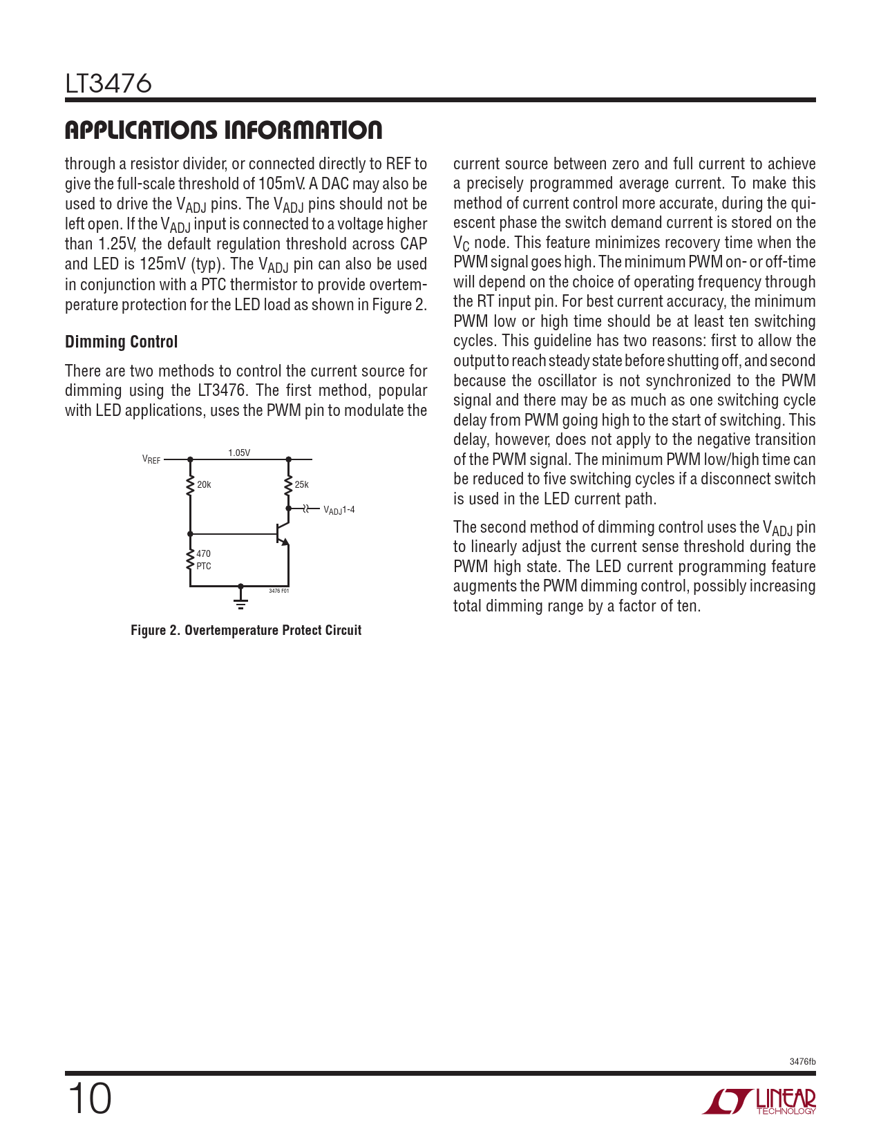 LT3476 ApplicAtions inForMAtion through a resistor divider, or connected directly to REF to current source between zero and full current to achieve give the full-scale threshold of 105mV. A DAC may also be a precisely programmed average current. To make this used to drive the VADJ pins. The VADJ pins should not be method of current control more accurate, during the qui- left open. If the VADJ input is connected to a voltage higher escent phase the switch demand current is stored on the than 1.25V, the default regulation threshold across CAP VC node. This feature minimizes recovery time when the and LED is 125mV (typ). The VADJ pin can also be used PWM signal goes high. The minimum PWM on- or off-time in conjunction with a PTC thermistor to provide overtem- will depend on the choice of operating frequency through perature protection for the LED load as shown in Figure 2. the RT input pin. For best current accuracy, the minimum PWM low or high time should be at least ten switching Dimming Control cycles. This guideline has two reasons: first to allow the There are two methods to control the current source for output to reach steady state before shutting off, and second dimming using the LT3476. The first method, popular because the oscillator is not synchronized to the PWM with LED applications, uses the PWM pin to modulate the signal and there may be as much as one switching cycle delay from PWM going high to the start of switching. This delay, however, does not apply to the negative transition V 1.05V REF of the PWM signal. The minimum PWM low/high time can 20k 25k be reduced to five switching cycles if a disconnect switch is used in the LED current path. VADJ1-4 The second method of dimming control uses the VADJ pin to linearly adjust the current sense threshold during the 470 PTC PWM high state. The LED current programming feature 3476 F01 augments the PWM dimming control, possibly increasing total dimming range by a factor of ten. Figure 2. Overtemperature Protect Circuit 3476fb 10 Document Outline Features Applications Description Typical Application Absolute Maximum Ratings Pin Configuration Order Information Electrical Characteristics Typical Performance Characteristics Pin Functions Block Diagram Operation Applications Information Typical Applications Package Description Revision History Typical Application Related Parts