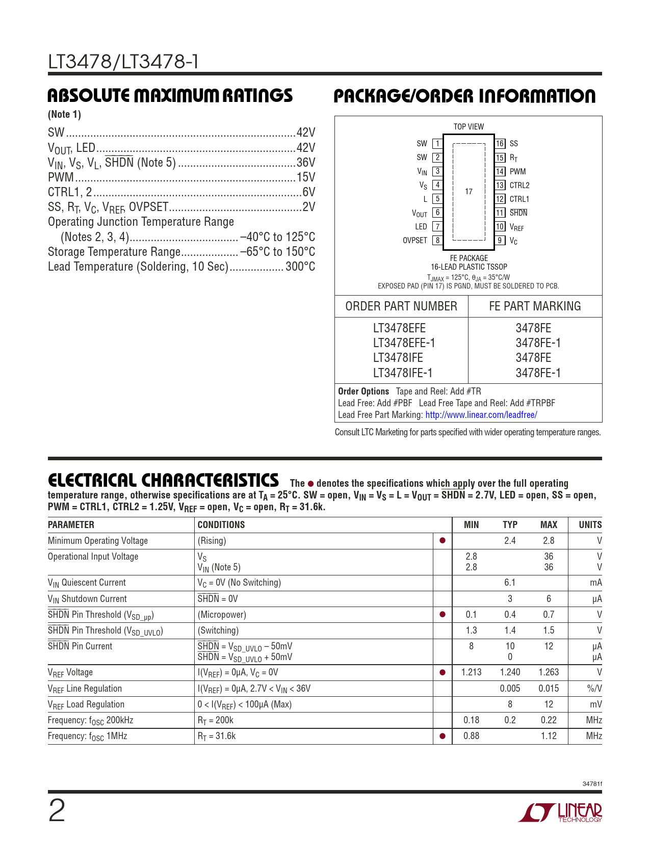 LT3478/LT3478-1 WWWUUWUABSOLUTE AXI URATI GSPACKAGE/ORDER I FOR ATIO(Note 1) TOP VIEW SW ..42V V SW 1 16 SS OUT, LED ..42V V SW 2 15 RT IN, VS, VL, ⎯S⎯H⎯D⎯N (Note 5) ...36V V 3 14 PWM PWM ...15V IN V 4 13 CTRL2 CTRL1, 2 ...6V S 17 L 5 12 CTRL1 SS, RT, VC, VREF, OVPSET ..2V V 6 11 OUT SHDN Operating Junction Temperature Range LED 7 10 VREF (Notes 2, 3, 4) .. –40°C to 125°C OVPSET 8 9 VC Storage Temperature Range ... –65°C to 150°C FE PACKAGE Lead Temperature (Soldering, 10 Sec) .. 300°C 16-LEAD PLASTIC TSSOP TJMAX = 125°C, θJA = 35°C/W EXPOSED PAD (PIN 17) IS PGND, MUST BE SOLDERED TO PCB. ORDER PART NUMBER FE PART MARKING LT3478EFE 3478FE LT3478EFE-1 3478FE-1 LT3478IFE 3478FE LT3478IFE-1 3478FE-1 Order Options Tape and Reel: Add #TR Lead Free: Add #PBF Lead Free Tape and Reel: Add #TRPBF Lead Free Part Marking: http://www.linear.com/leadfree/ Consult LTC Marketing for parts specifi ed with wider operating temperature ranges. TheELECTRICAL CHARACTERISTICS ● denotes the specifi cations which apply over the full operatingtemperature range, otherwise specifi cations are at TA = 25°C. SW = open, VIN = VS = L = VOUT = ⎯ S ⎯ H ⎯ D ⎯ N = 2.7V, LED = open, SS = open, PWM = CTRL1, CTRL2 = 1.25V, VREF = open, VC = open, RT = 31.6k.PARAMETERCONDITIONSMINTYPMAXUNITS Minimum Operating Voltage (Rising) ● 2.4 2.8 V Operational Input Voltage VS 2.8 36 V VIN (Note 5) 2.8 36 V VIN Quiescent Current VC = 0V (No Switching) 6.1 mA VIN Shutdown Current ⎯S⎯H⎯D⎯N = 0V 3 6 µA ⎯S⎯H⎯D⎯N Pin Threshold (VSD_µp) (Micropower) ● 0.1 0.4 0.7 V ⎯S⎯H⎯D⎯N Pin Threshold (VSD_UVLO) (Switching) 1.3 1.4 1.5 V ⎯S⎯H⎯D⎯N Pin Current ⎯S⎯H⎯D⎯N = VSD_UVLO – 50mV 8 10 12 µA ⎯S⎯H⎯D⎯N = VSD_UVLO + 50mV 0 µA VREF Voltage I(VREF) = 0µA, VC = 0V ● 1.213 1.240 1.263 V VREF Line Regulation I(VREF) = 0µA, 2.7V < VIN < 36V 0.005 0.015 %/V VREF Load Regulation 0 < I(VREF) < 100µA (Max) 8 12 mV Frequency: fOSC 200kHz RT = 200k 0.18 0.2 0.22 MHz Frequency: fOSC 1MHz RT = 31.6k ● 0.88 1.12 MHz 34781f 2