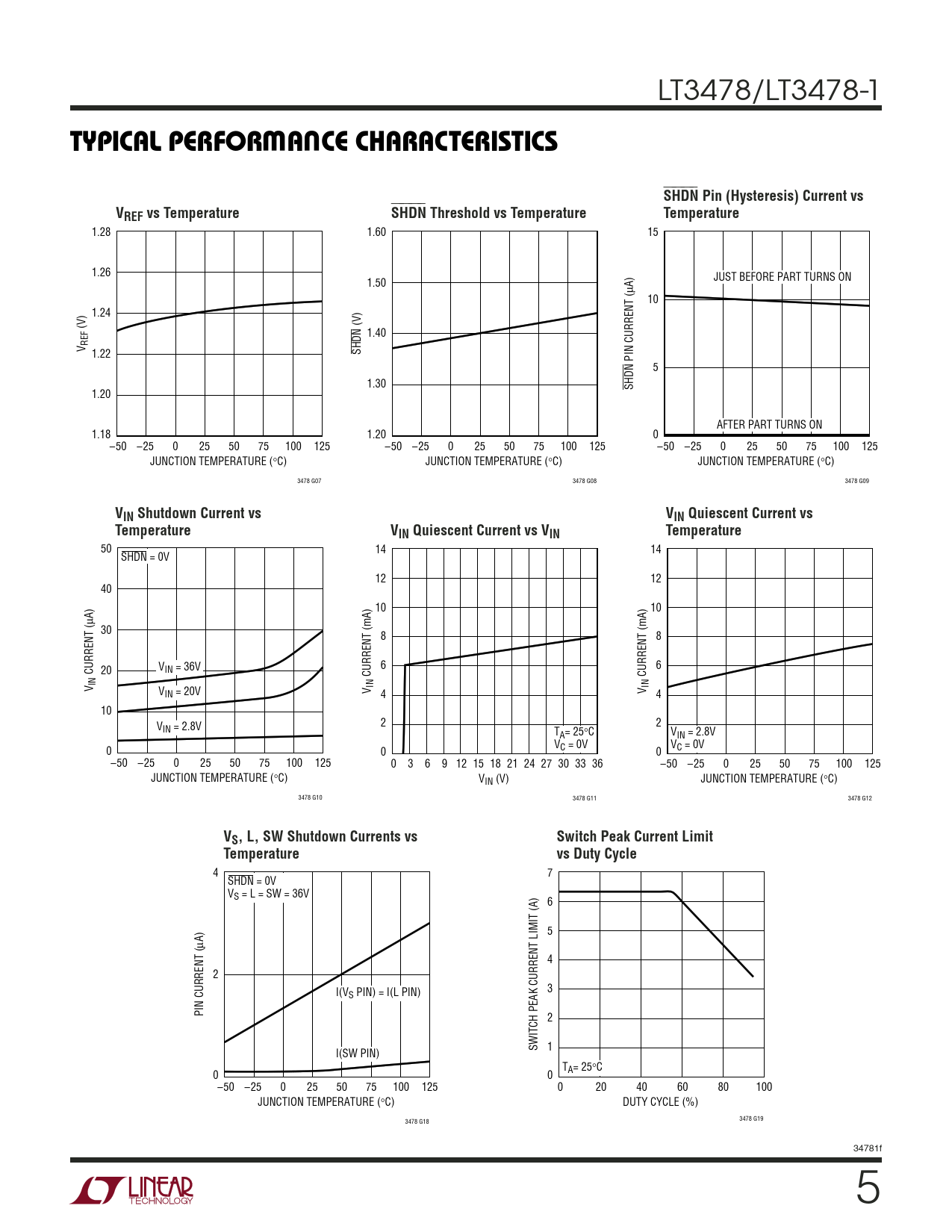 4 7 SHDN = 0V VS = L = SW = 36V 6 5 µA) 4 2 3 I(VS PIN) = I(L PIN) PIN CURRENT ( 2 SWITCH PEAK CURRENT LIMIT (A) 1 I(SW PIN) TA= 25°C 0 0 –50 –25 0 25 50 75 100 125 0 20 40 60 80 100 JUNCTION TEMPERATURE (°C) DUTY CYCLE (%) 3478 G19 3478 G18 34781f 5