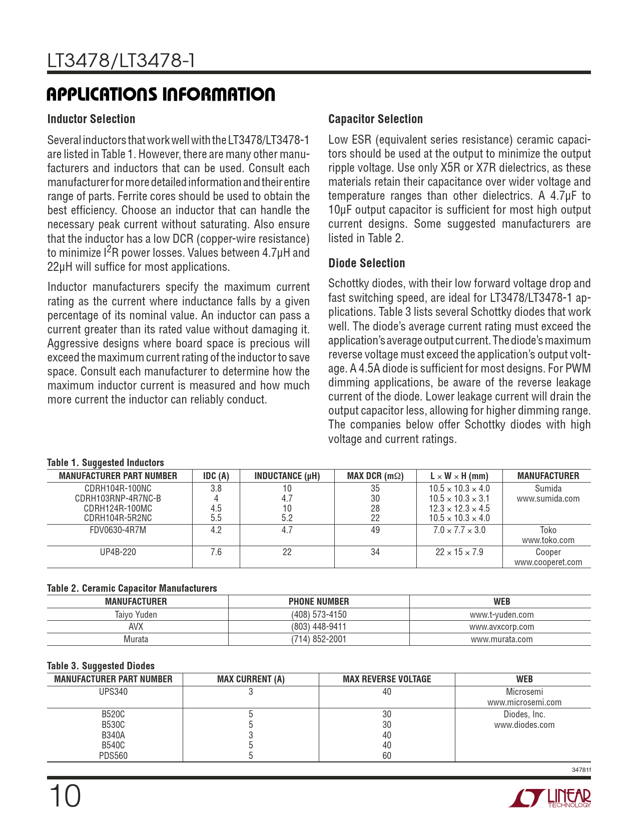 LT3478/LT3478-1 UUWUAPPLICATIO S I FOR ATIOInductor SelectionCapacitor Selection Several inductors that work well with the LT3478/LT3478-1 Low ESR (equivalent series resistance) ceramic capaci- are listed in Table 1. However, there are many other manu- tors should be used at the output to minimize the output facturers and inductors that can be used. Consult each ripple voltage. Use only X5R or X7R dielectrics, as these manufacturer for more detailed information and their entire materials retain their capacitance over wider voltage and range of parts. Ferrite cores should be used to obtain the temperature ranges than other dielectrics. A 4.7µF to best effi ciency. Choose an inductor that can handle the 10µF output capacitor is suffi cient for most high output necessary peak current without saturating. Also ensure current designs. Some suggested manufacturers are that the inductor has a low DCR (copper-wire resistance) listed in Table 2. to minimize I2R power losses. Values between 4.7µH and 22µH will suffi ce for most applications. Diode Selection Inductor manufacturers specify the maximum current Schottky diodes, with their low forward voltage drop and rating as the current where inductance falls by a given fast switching speed, are ideal for LT3478/LT3478-1 ap- percentage of its nominal value. An inductor can pass a plications. Table 3 lists several Schottky diodes that work current greater than its rated value without damaging it. well. The diode’s average current rating must exceed the Aggressive designs where board space is precious will application’s average output current. The diode’s maximum exceed the maximum current rating of the inductor to save reverse voltage must exceed the application’s output volt- space. Consult each manufacturer to determine how the age. A 4.5A diode is suffi cient for most designs. For PWM maximum inductor current is measured and how much dimming applications, be aware of the reverse leakage more current the inductor can reliably conduct. current of the diode. Lower leakage current will drain the output capacitor less, allowing for higher dimming range. The companies below offer Schottky diodes with high voltage and current ratings. Table 1. Suggested InductorsMANUFACTURER PART NUMBERIDC (A)INDUCTANCE (µH)MAX DCR (m Ω )L × W × H (mm)MANUFACTURER CDRH104R-100NC 3.8 10 35 10.5 × 10.3 × 4.0 Sumida CDRH103RNP-4R7NC-B 4 4.7 30 10.5 × 10.3 × 3.1 www.sumida.com CDRH124R-100MC 4.5 10 28 12.3 × 12.3 × 4.5 CDRH104R-5R2NC 5.5 5.2 22 10.5 × 10.3 × 4.0 FDV0630-4R7M 4.2 4.7 49 7.0 × 7.7 × 3.0 Toko www.toko.com UP4B-220 7.6 22 34 22 × 15 × 7.9 Cooper www.cooperet.com Table 2. Ceramic Capacitor ManufacturersMANUFACTURERPHONE NUMBERWEB Taiyo Yuden (408) 573-4150 www.t-yuden.com AVX (803) 448-9411 www.avxcorp.com Murata (714) 852-2001 www.murata.com Table 3. Suggested DiodesMANUFACTURER PART NUMBERMAX CURRENT (A)MAX REVERSE VOLTAGEWEB UPS340 3 40 Microsemi www.microsemi.com B520C 5 30 Diodes, Inc. B530C 5 30 www.diodes.com B340A 3 40 B540C 5 40 PDS560 5 60 34781f 10