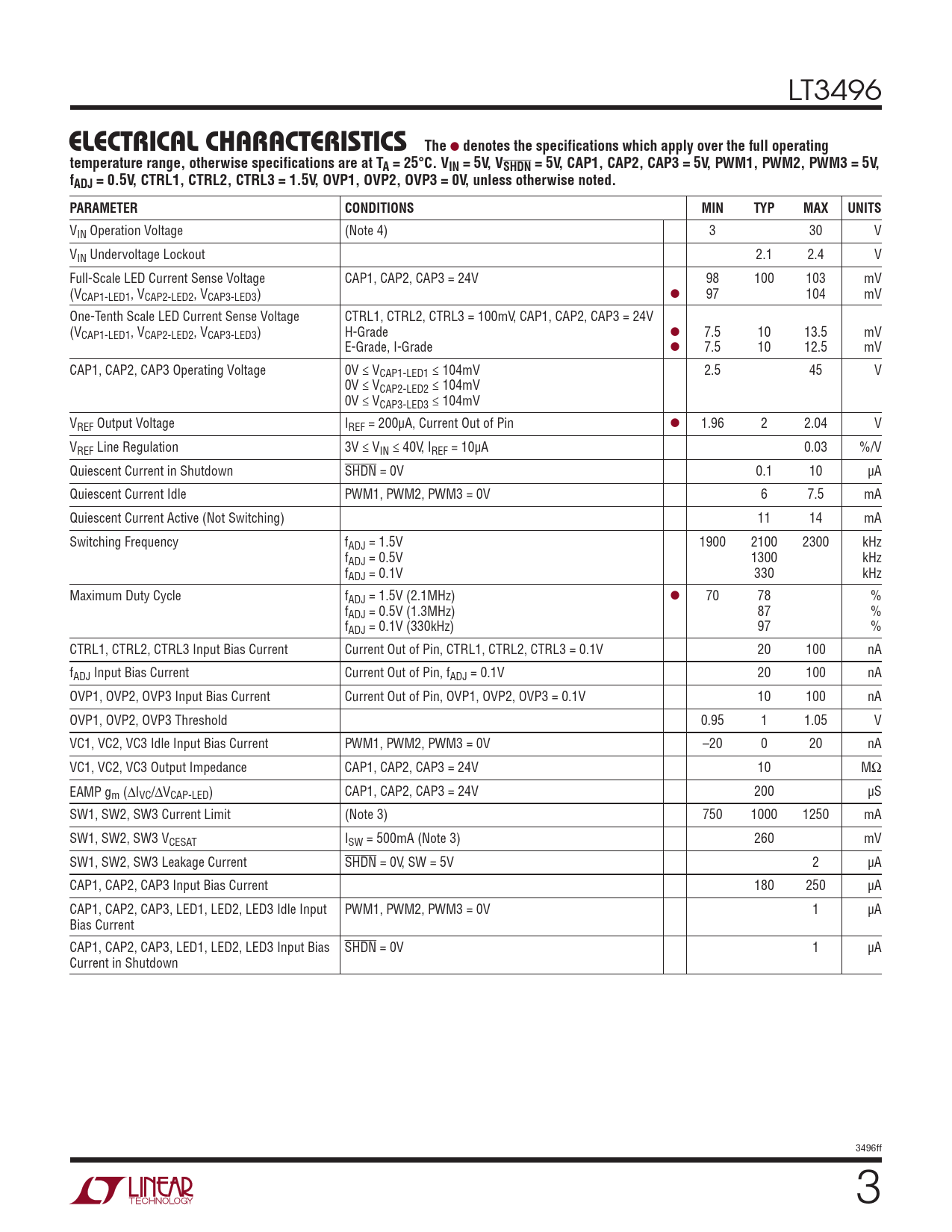 VIN Operation Voltage (Note 4) 3 30 V VIN Undervoltage Lockout 2.1 2.4 V Full-Scale LED Current Sense Voltage CAP1, CAP2, CAP3 = 24V 98 100 103 mV (VCAP1-LED1, VCAP2-LED2, VCAP3-LED3) l 97 104 mV One-Tenth Scale LED Current Sense Voltage CTRL1, CTRL2, CTRL3 = 100mV, CAP1, CAP2, CAP3 = 24V (VCAP1-LED1, VCAP2-LED2, VCAP3-LED3) H-Grade l 7.5 10 13.5 mV E-Grade, I-Grade l 7.5 10 12.5 mV CAP1, CAP2, CAP3 Operating Voltage 0V ≤ VCAP1-LED1 ≤ 104mV 2.5 45 V 0V ≤ VCAP2-LED2 ≤ 104mV 0V ≤ VCAP3-LED3 ≤ 104mV VREF Output Voltage IREF = 200µA, Current Out of Pin l 1.96 2 2.04 V VREF Line Regulation 3V ≤ VIN ≤ 40V, IREF = 10µA 0.03 %/V Quiescent Current in Shutdown SHDN = 0V 0.1 10 µA Quiescent Current Idle PWM1, PWM2, PWM3 = 0V 6 7.5 mA Quiescent Current Active (Not Switching) 11 14 mA Switching Frequency fADJ = 1.5V 1900 2100 2300 kHz fADJ = 0.5V 1300 kHz fADJ = 0.1V 330 kHz Maximum Duty Cycle fADJ = 1.5V (2.1MHz) l 70 78 % fADJ = 0.5V (1.3MHz) 87 % fADJ = 0.1V (330kHz) 97 % CTRL1, CTRL2, CTRL3 Input Bias Current Current Out of Pin, CTRL1, CTRL2, CTRL3 = 0.1V 20 100 nA fADJ Input Bias Current Current Out of Pin, fADJ = 0.1V 20 100 nA OVP1, OVP2, OVP3 Input Bias Current Current Out of Pin, OVP1, OVP2, OVP3 = 0.1V 10 100 nA OVP1, OVP2, OVP3 Threshold 0.95 1 1.05 V VC1, VC2, VC3 Idle Input Bias Current PWM1, PWM2, PWM3 = 0V –20 0 20 nA VC1, VC2, VC3 Output Impedance CAP1, CAP2, CAP3 = 24V 10 MΩ EAMP gm (ΔIVC/ΔVCAP-LED) CAP1, CAP2, CAP3 = 24V 200 µS SW1, SW2, SW3 Current Limit (Note 3) 750 1000 1250 mA SW1, SW2, SW3 VCESAT ISW = 500mA (Note 3) 260 mV SW1, SW2, SW3 Leakage Current SHDN = 0V, SW = 5V 2 µA CAP1, CAP2, CAP3 Input Bias Current 180 250 µA CAP1, CAP2, CAP3, LED1, LED2, LED3 Idle Input PWM1, PWM2, PWM3 = 0V 1 µA Bias Current CAP1, CAP2, CAP3, LED1, LED2, LED3 Input Bias SHDN = 0V 1 µA Current in Shutdown 3496ff Document Outline Features Applications Description Typical Application Absolute Maximum Ratings Pin Configuration Order Information Electrical Characteristics Typical Performance Characteristics Pin Functions Block Diagram Applications Information Typical Applications Package Description Revision History Typical Application Related Parts