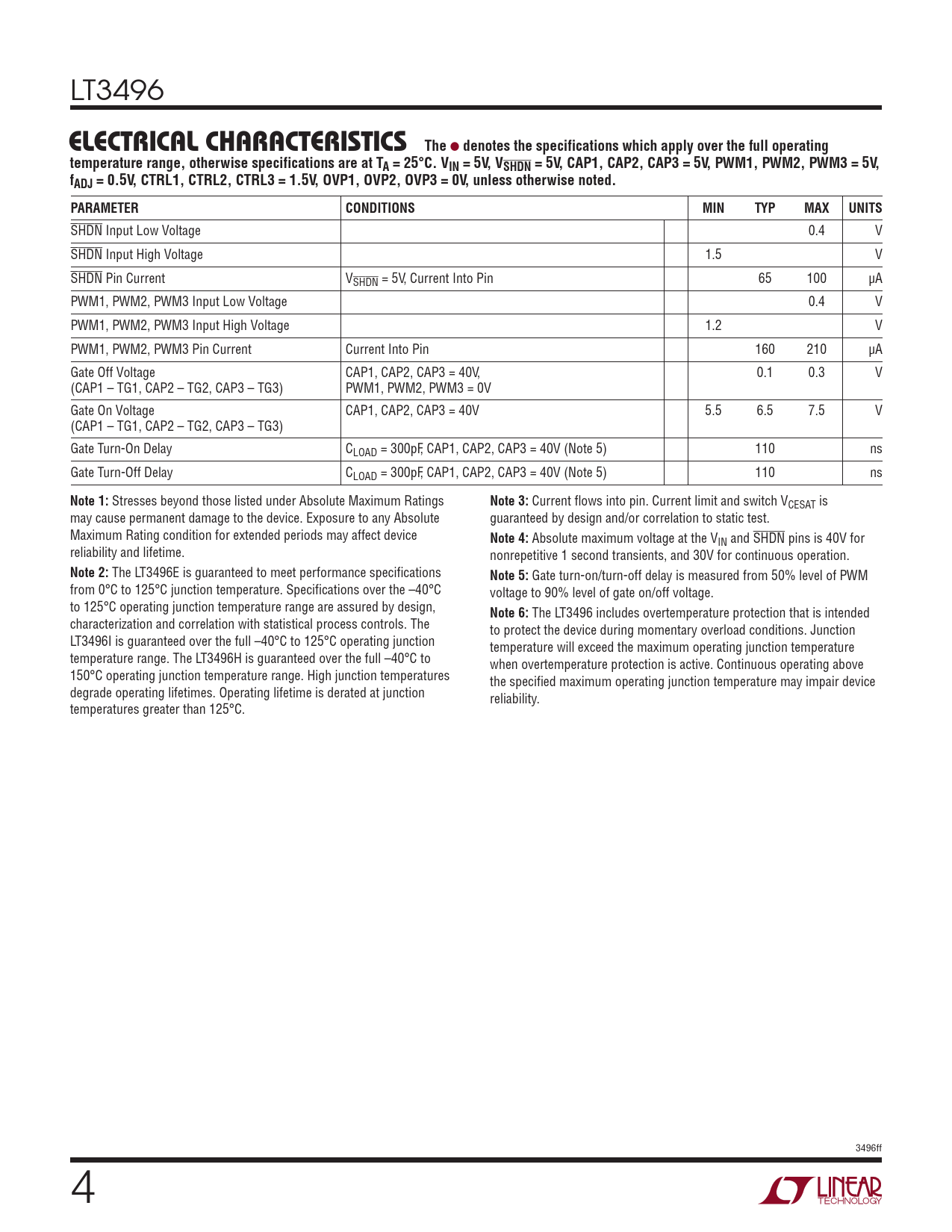 LT3496 electrical characteristics The l denotes the specifications which apply over the full operatingtemperature range, otherwise specifications are at TA = 25°C. VIN = 5V, VSHDN = 5V, CAP1, CAP2, CAP3 = 5V, PWM1, PWM2, PWM3 = 5V,fADJ = 0.5V, CTRL1, CTRL2, CTRL3 = 1.5V, OVP1, OVP2, OVP3 = 0V, unless otherwise noted.PARAMETERCONDITIONSMINTYPMAXUNITS SHDN Input Low Voltage 0.4 V SHDN Input High Voltage 1.5 V SHDN Pin Current VSHDN = 5V, Current Into Pin 65 100 µA PWM1, PWM2, PWM3 Input Low Voltage 0.4 V PWM1, PWM2, PWM3 Input High Voltage 1.2 V PWM1, PWM2, PWM3 Pin Current Current Into Pin 160 210 µA Gate Off Voltage CAP1, CAP2, CAP3 = 40V, 0.1 0.3 V (CAP1 – TG1, CAP2 – TG2, CAP3 – TG3) PWM1, PWM2, PWM3 = 0V Gate On Voltage CAP1, CAP2, CAP3 = 40V 5.5 6.5 7.5 V (CAP1 – TG1, CAP2 – TG2, CAP3 – TG3) Gate Turn-On Delay CLOAD = 300pF, CAP1, CAP2, CAP3 = 40V (Note 5) 110 ns Gate Turn-Off Delay CLOAD = 300pF, CAP1, CAP2, CAP3 = 40V (Note 5) 110 ns Note 1: Stresses beyond those listed under Absolute Maximum Ratings Note 3: Current flows into pin. Current limit and switch VCESAT is may cause permanent damage to the device. Exposure to any Absolute guaranteed by design and/or correlation to static test. Maximum Rating condition for extended periods may affect device Note 4: Absolute maximum voltage at the VIN and SHDN pins is 40V for reliability and lifetime. nonrepetitive 1 second transients, and 30V for continuous operation. Note 2: The LT3496E is guaranteed to meet performance specifications Note 5: Gate turn-on/turn-off delay is measured from 50% level of PWM from 0°C to 125°C junction temperature. Specifications over the –40°C voltage to 90% level of gate on/off voltage. to 125°C operating junction temperature range are assured by design, Note 6: The LT3496 includes overtemperature protection that is intended characterization and correlation with statistical process controls. The to protect the device during momentary overload conditions. Junction LT3496I is guaranteed over the full –40°C to 125°C operating junction temperature will exceed the maximum operating junction temperature temperature range. The LT3496H is guaranteed over the full –40°C to when overtemperature protection is active. Continuous operating above 150°C operating junction temperature range. High junction temperatures the specified maximum operating junction temperature may impair device degrade operating lifetimes. Operating lifetime is derated at junction reliability. temperatures greater than 125°C. 3496ff Document Outline Features Applications Description Typical Application Absolute Maximum Ratings Pin Configuration Order Information Electrical Characteristics Typical Performance Characteristics Pin Functions Block Diagram Applications Information Typical Applications Package Description Revision History Typical Application Related Parts