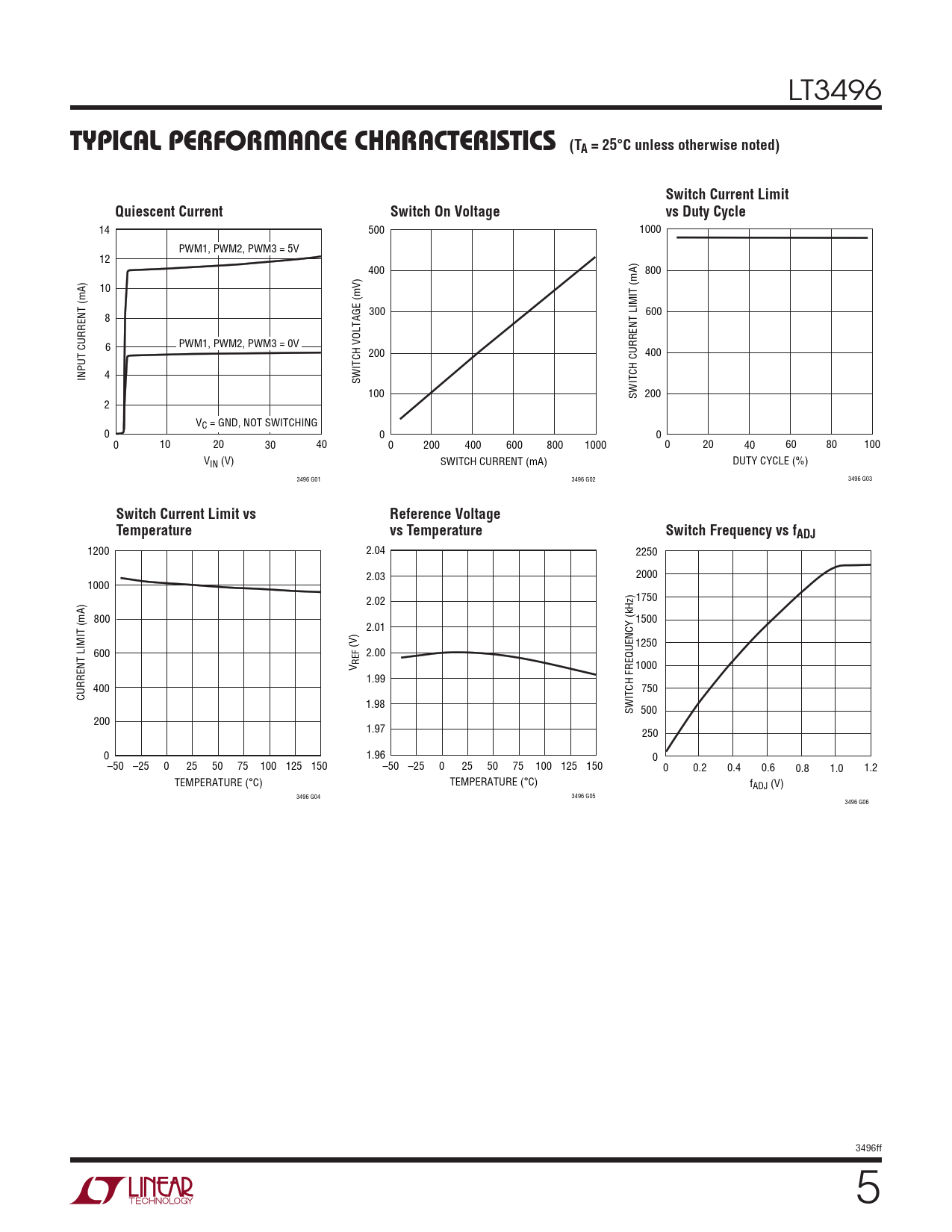 1200 2.04 2250 2.03 2000 1000 2.02 1750 800 1500 2.01 (V) 1250 600 2.00 V REF 1000 1.99 400 750 CURRENT LIMIT (mA) 1.98 SWITCH FREQUENCY (kHz) 500 200 1.97 250 0 1.96 0 –50 –25 0 25 50 75 100 125 150 –50 –25 0 25 50 75 100 125 150 0 0.2 0.4 0.6 0.8 1.0 1.2 TEMPERATURE (°C) TEMPERATURE (°C) fADJ (V) 3496 G04 3496 G05 3496 G06 3496ff Document Outline Features Applications Description Typical Application Absolute Maximum Ratings Pin Configuration Order Information Electrical Characteristics Typical Performance Characteristics Pin Functions Block Diagram Applications Information Typical Applications Package Description Revision History Typical Application Related Parts