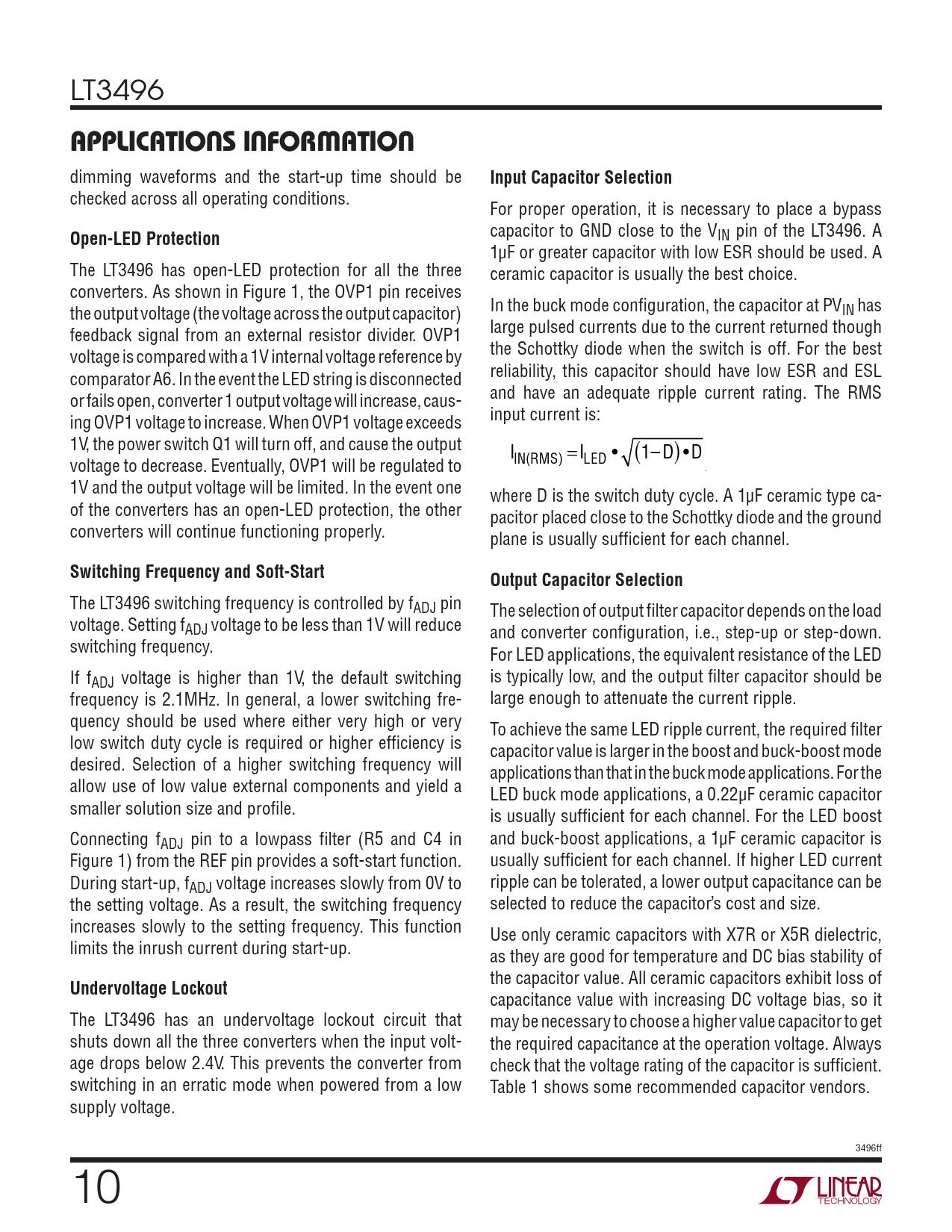 LT3496 applications inForMation dimming waveforms and the start-up time should be Input Capacitor Selection checked across all operating conditions. For proper operation, it is necessary to place a bypass Open-LED Protection capacitor to GND close to the VIN pin of the LT3496. A 1µF or greater capacitor with low ESR should be used. A The LT3496 has open-LED protection for all the three ceramic capacitor is usually the best choice. converters. As shown in Figure 1, the OVP1 pin receives the output voltage (the voltage across the output capacitor) In the buck mode configuration, the capacitor at PVIN has feedback signal from an external resistor divider. OVP1 large pulsed currents due to the current returned though voltage is compared with a 1V internal voltage reference by the Schottky diode when the switch is off. For the best comparator A6. In the event the LED string is disconnected reliability, this capacitor should have low ESR and ESL or fails open, converter 1 output voltage wil increase, caus- and have an adequate ripple current rating. The RMS ing OVP1 voltage to increase. When OVP1 voltage exceeds input current is: 1V, the power switch Q1 will turn off, and cause the output I ( )•D voltage to decrease. Eventually, OVP1 will be regulated to IN(RMS) =ILED • 1– D 1V and the output voltage will be limited. In the event one where D is the switch duty cycle. A 1µF ceramic type ca- of the converters has an open-LED protection, the other pacitor placed close to the Schottky diode and the ground converters will continue functioning properly. plane is usually sufficient for each channel. Switching Frequency and Soft-StartOutput Capacitor Selection The LT3496 switching frequency is controlled by fADJ pin The selection of output filter capacitor depends on the load voltage. Setting fADJ voltage to be less than 1V will reduce and converter configuration, i.e., step-up or step-down. switching frequency. For LED applications, the equivalent resistance of the LED If fADJ voltage is higher than 1V, the default switching is typically low, and the output filter capacitor should be frequency is 2.1MHz. In general, a lower switching fre- large enough to attenuate the current ripple. quency should be used where either very high or very To achieve the same LED ripple current, the required filter low switch duty cycle is required or higher efficiency is capacitor value is larger in the boost and buck-boost mode desired. Selection of a higher switching frequency will applications than that in the buck mode applications. For the allow use of low value external components and yield a LED buck mode applications, a 0.22µF ceramic capacitor smaller solution size and profile. is usually sufficient for each channel. For the LED boost Connecting fADJ pin to a lowpass filter (R5 and C4 in and buck-boost applications, a 1µF ceramic capacitor is Figure 1) from the REF pin provides a soft-start function. usually sufficient for each channel. If higher LED current During start-up, fADJ voltage increases slowly from 0V to ripple can be tolerated, a lower output capacitance can be the setting voltage. As a result, the switching frequency selected to reduce the capacitor’s cost and size. increases slowly to the setting frequency. This function Use only ceramic capacitors with X7R or X5R dielectric, limits the inrush current during start-up. as they are good for temperature and DC bias stability of Undervoltage Lockout the capacitor value. All ceramic capacitors exhibit loss of capacitance value with increasing DC voltage bias, so it The LT3496 has an undervoltage lockout circuit that may be necessary to choose a higher value capacitor to get shuts down all the three converters when the input volt- the required capacitance at the operation voltage. Always age drops below 2.4V. This prevents the converter from check that the voltage rating of the capacitor is sufficient. switching in an erratic mode when powered from a low Table 1 shows some recommended capacitor vendors. supply voltage. 3496ff 0 Document Outline Features Applications Description Typical Application Absolute Maximum Ratings Pin Configuration Order Information Electrical Characteristics Typical Performance Characteristics Pin Functions Block Diagram Applications Information Typical Applications Package Description Revision History Typical Application Related Parts