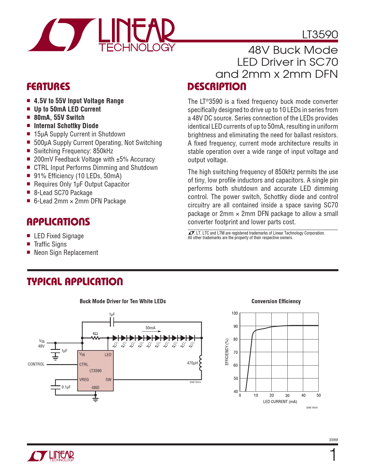 LT3590 48V Buck Mode LED Driver in SC70 and 2mm x 2mm DFN FEATURESDESCRIPTION ■ 4.5V to 55V Input Voltage Range The LT®3590 is a fi xed frequency buck mode converter ■ Up to 50mA LED Current specifi cally designed to drive up to 10 LEDs in series from ■ 80mA, 55V Switch a 48V DC source. Series connection of the LEDs provides ■ Internal Schottky Diode identical LED currents of up to 50mA, resulting in uniform ■ 15μA Supply Current in Shutdown brightness and eliminating the need for ballast resistors. ■ 500μA Supply Current Operating, Not Switching A fi xed frequency, current mode architecture results in ■ Switching Frequency: 850kHz stable operation over a wide range of input voltage and ■ 200mV Feedback Voltage with ±5% Accuracy output voltage. ■ CTRL Input Performs Dimming and Shutdown The high switching frequency of 850kHz permits the use ■ 91% Effi ciency (10 LEDs, 50mA) of tiny, low profi le inductors and capacitors. A single pin ■ Requires Only 1μF Output Capacitor performs both shutdown and accurate LED dimming ■ 8-Lead SC70 Package control. The power switch, Schottky diode and control ■ 6-Lead 2mm × 2mm DFN Package circuitry are all contained inside a space saving SC70 package or 2mm × 2mm DFN package to allow a small APPLICATIONS converter footprint and lower parts cost. , LT, LTC and LTM are registered trademarks of Linear Technology Corporation. ■ LED Fixed Signage All other trademarks are the property of their respective owners. ■ Traffi c Signs ■ Neon Sign Replacement TYPICAL APPLICATIONBuck Mode Driver for Ten White LEDsConversion Effi ciency 1μF 100 50mA 90 4Ω V 80 IN 48V 1μF V 70 IN LED CONTROL CTRL 470μH EFFICIENCY (%) 60 LT3590 VREG SW 50 3590 TA01a 0.1μF GND 40 0 10 20 30 40 50 LED CURRENT (mA) 3590 TA01b 3590f 1