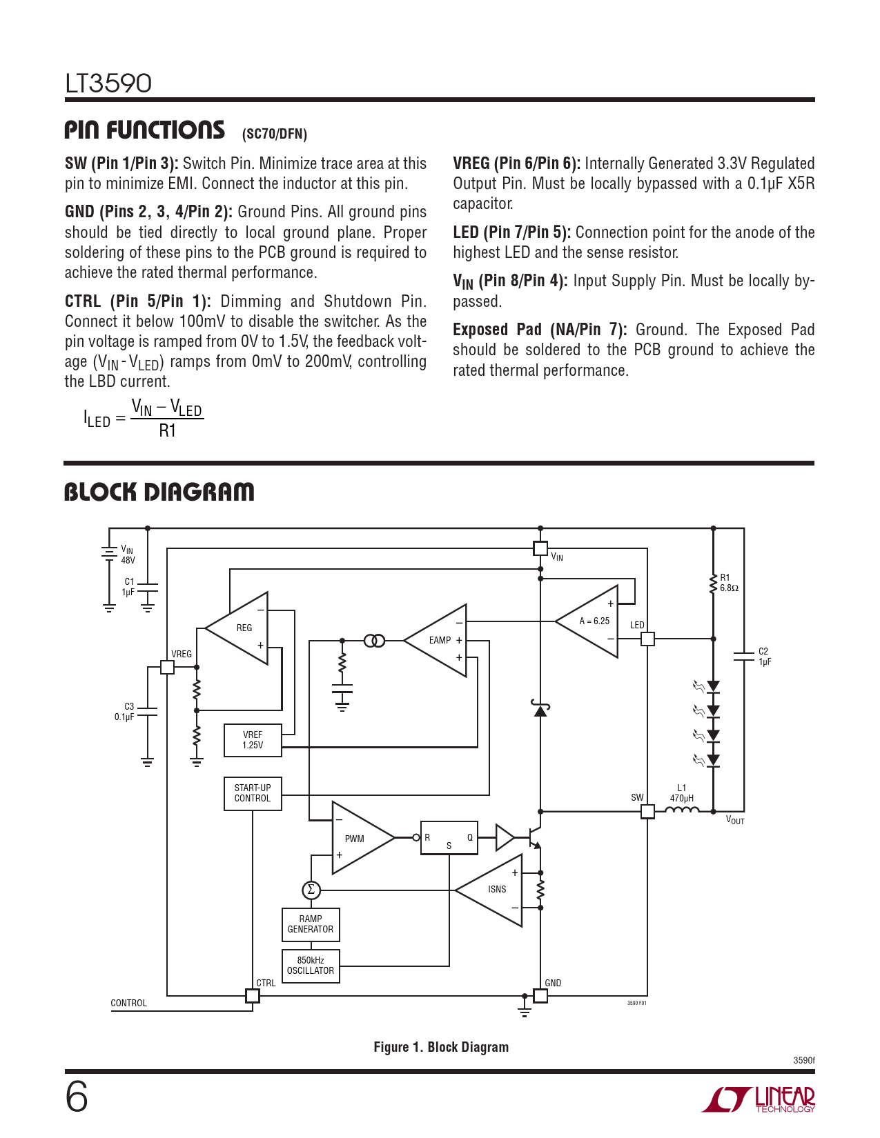 LT3590 PIN FUNCTIONS (SC70/DFN)SW (Pin 1/Pin 3): Switch Pin. Minimize trace area at this VREG (Pin 6/Pin 6): Internally Generated 3.3V Regulated pin to minimize EMI. Connect the inductor at this pin. Output Pin. Must be locally bypassed with a 0.1μF X5R capacitor. GND (Pins 2, 3, 4/Pin 2): Ground Pins. All ground pins should be tied directly to local ground plane. Proper LED (Pin 7/Pin 5): Connection point for the anode of the soldering of these pins to the PCB ground is required to highest LED and the sense resistor. achieve the rated thermal performance. VIN (Pin 8/Pin 4): Input Supply Pin. Must be locally by- CTRL (Pin 5/Pin 1): Dimming and Shutdown Pin. passed. Connect it below 100mV to disable the switcher. As the Exposed Pad (NA/Pin 7): Ground. The Exposed Pad pin voltage is ramped from 0V to 1.5V, the feedback volt- should be soldered to the PCB ground to achieve the age (VIN - VLED) ramps from 0mV to 200mV, controlling rated thermal performance. the LBD current. V − V I IN LED LED = R1 BLOCK DIAGRAM VIN 48V VIN R1 C1 6.8Ω 1μF – + – A = 6.25 LED REG + EAMP + – C2 VREG + 1μF C3 0.1μF VREF 1.25V START-UP L1 CONTROL SW 470μH – VOUT PWM R Q + S + ∑ ISNS – RAMP GENERATOR 850kHz OSCILLATOR CTRL GND CONTROL 3590 F01 Figure 1. Block Diagram 3590f 6