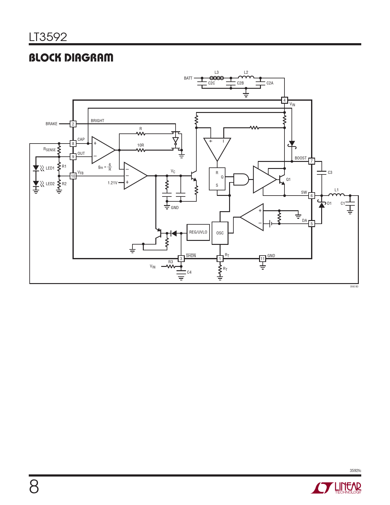 L3 L2 BATT C2C C2B C2A 4 VIN BRIGHT BRAKE 2 R CAP + – 8 + 10R RSENSE OUT 9 – BOOST 7 R1 6 g – LED1 m = R V V FB C – R C3 10 Q + Q1 1.21V LED2 R2 S L1 SW 6 D1 C1 GND + DA – 5 REG/UVLO OSC SHDN RT GND 3 1 11 R3 VIN RT C4 3592 BD 3592fc 8