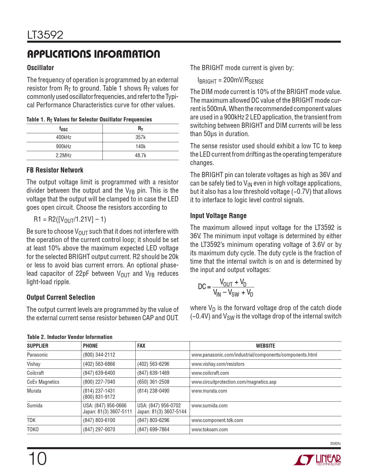 LT3592 APPLICATIONS INFORMATION Oscillator The BRIGHT mode current is given by: The frequency of operation is programmed by an external IBRIGHT = 200mV/RSENSE resistor from RT to ground. Table 1 shows RT values for The DIM mode current is 10% of the BRIGHT mode value. commonly used oscillator frequencies, and refer to the Typi- The maximum allowed DC value of the BRIGHT mode cur- cal Performance Characteristics curve for other values. rent is 500mA. When the recommended component values are used in a 900kHz 2 LED application, the transient from Table 1. RT Values for Selector Oscillator Frequencies switching between BRIGHT and DIM currents will be less fOSCRT than 50μs in duration. 400kHz 357k 900kHz 140k The sense resistor used should exhibit a low TC to keep 2.2MHz 48.7k the LED current from drifting as the operating temperature changes. FB Resistor Network The BRIGHT pin can tolerate voltages as high as 36V and The output voltage limit is programmed with a resistor can be safely tied to VIN even in high voltage applications, divider between the output and the VFB pin. This is the but it also has a low threshold voltage (~0.7V) that allows voltage that the output will be clamped to in case the LED it to interface to logic level control signals. goes open circuit. Choose the resistors according to Input Voltage Range R1 = R2([VOUT/1.21V] – 1) The maximum allowed input voltage for the LT3592 is Be sure to choose VOUT such that it does not interfere with 36V. The minimum input voltage is determined by either the operation of the current control loop; it should be set the LT3592’s minimum operating voltage of 3.6V or by at least 10% above the maximum expected LED voltage its maximum duty cycle. The duty cycle is the fraction of for the selected BRIGHT output current. R2 should be 20k time that the internal switch is on and is determined by or less to avoid bias current errors. An optional phase- the input and output voltages: lead capacitor of 22pF between VOUT and VFB reduces light-load ripple. V DC = OUT + VD V – V IN SW + VD Output Current Selection where V The output current levels are programmed by the value of D is the forward voltage drop of the catch diode (~0.4V) and V the external current sense resistor between CAP and OUT. SW is the voltage drop of the internal switch Table 2. Inductor Vendor InformationSUPPLIERPHONEFAXWEBSITE Panasonic (800) 344-2112 www.panasonic.com/industrial/components/components.html Vishay (402) 563-6866 (402) 563-6296 www.vishay.com/resistors Coilcraft (847) 639-6400 (847) 639-1469 www.coilcraft.com CoEv Magnetics (800) 227-7040 (650) 361-2508 www.circuitprotection.com/magnetics.asp Murata (814) 237-1431 (814) 238-0490 www.murata.com (800) 831-9172 Sumida USA: (847) 956-0666 USA: (847) 956-0702 www.sumida.com Japan: 81(3) 3607-5111 Japan: 81(3) 3607-5144 TDK (847) 803-6100 (847) 803-6296 www.component.tdk.com TOKO (847) 297-0070 (847) 699-7864 www.tokoam.com 3592fc 10