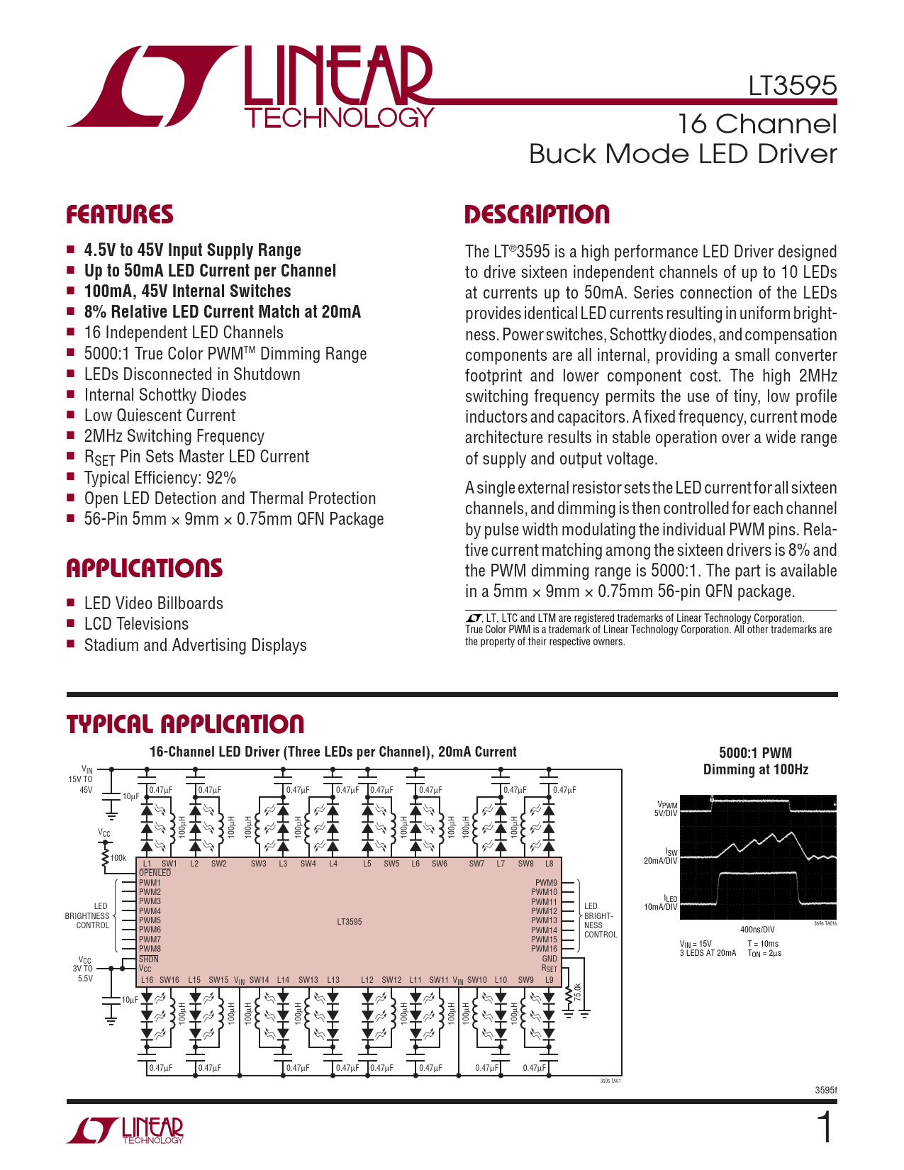 the PWM dimming range is 5000:1. The part is available in a 5mm × 9mm × 0.75mm 56-pin QFN package. ■ LED Video Billboards , LT, LTC and LTM are registered trademarks of Linear Technology Corporation. ■ LCD Televisions True Color PWM is a trademark of Linear Technology Corporation. All other trademarks are the property of their respective owners. ■ Stadium and Advertising Displays